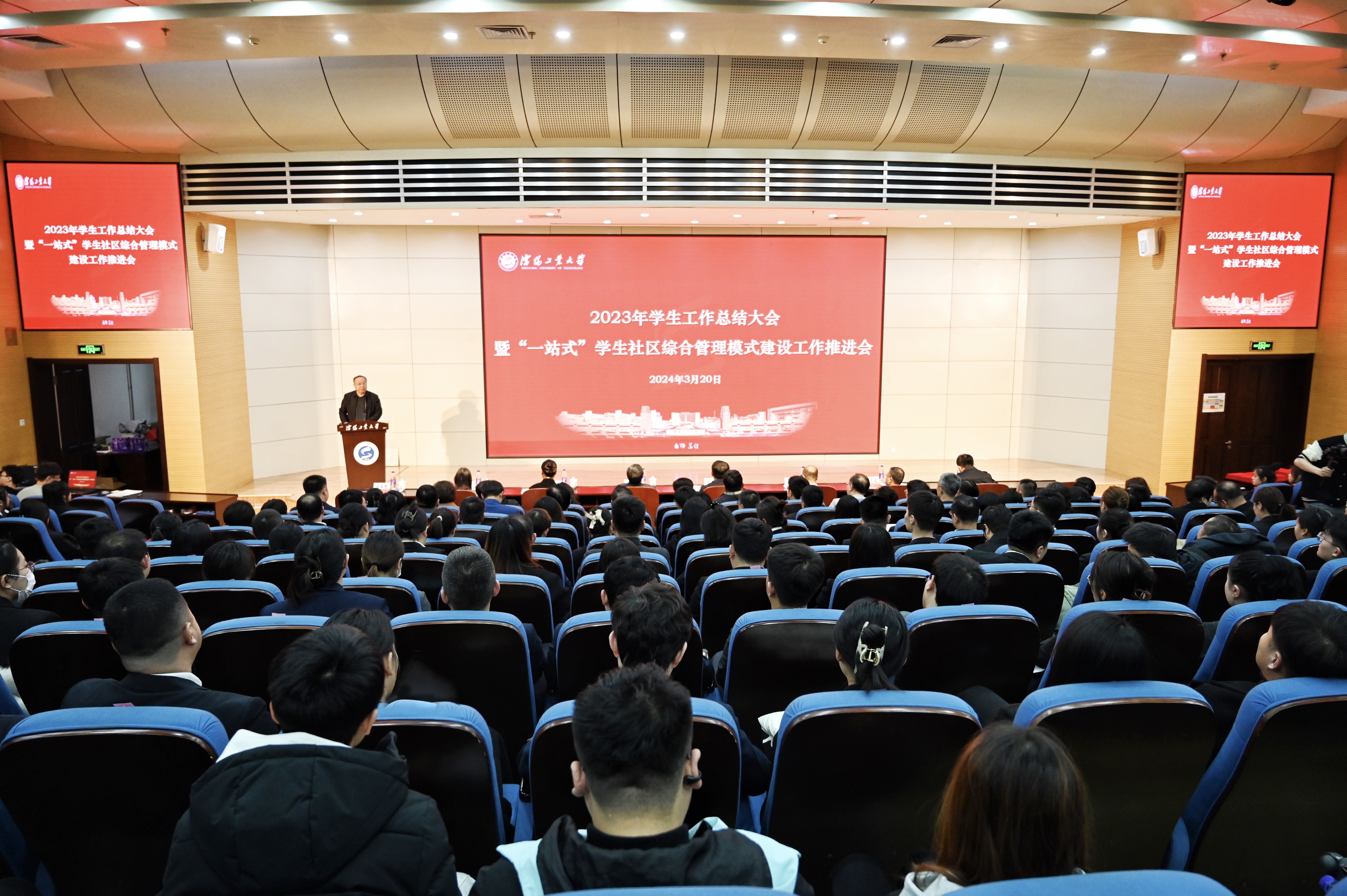 3月20日,2023年学生工作总结大会暨“一站式”学生社区综合管理模式建设工作推进会在科学会堂召开。党委书记贾玉明,党委副书记、校长张珂,党委副书记赵璟,党委常委、副校长陈延明,党委常委、纪委书记陈卫国,党委常委、副校长柯丽、孙秋野出席会议。会议还特别邀请了中共辽宁省委教育工委宣传部部长、省教育厅思政处处长胡承波出席。相关职能部门负责人、二级学院党政负责人、全体学生工作干部、教师代表以及学生代表参加会议。陈延明主持会议。