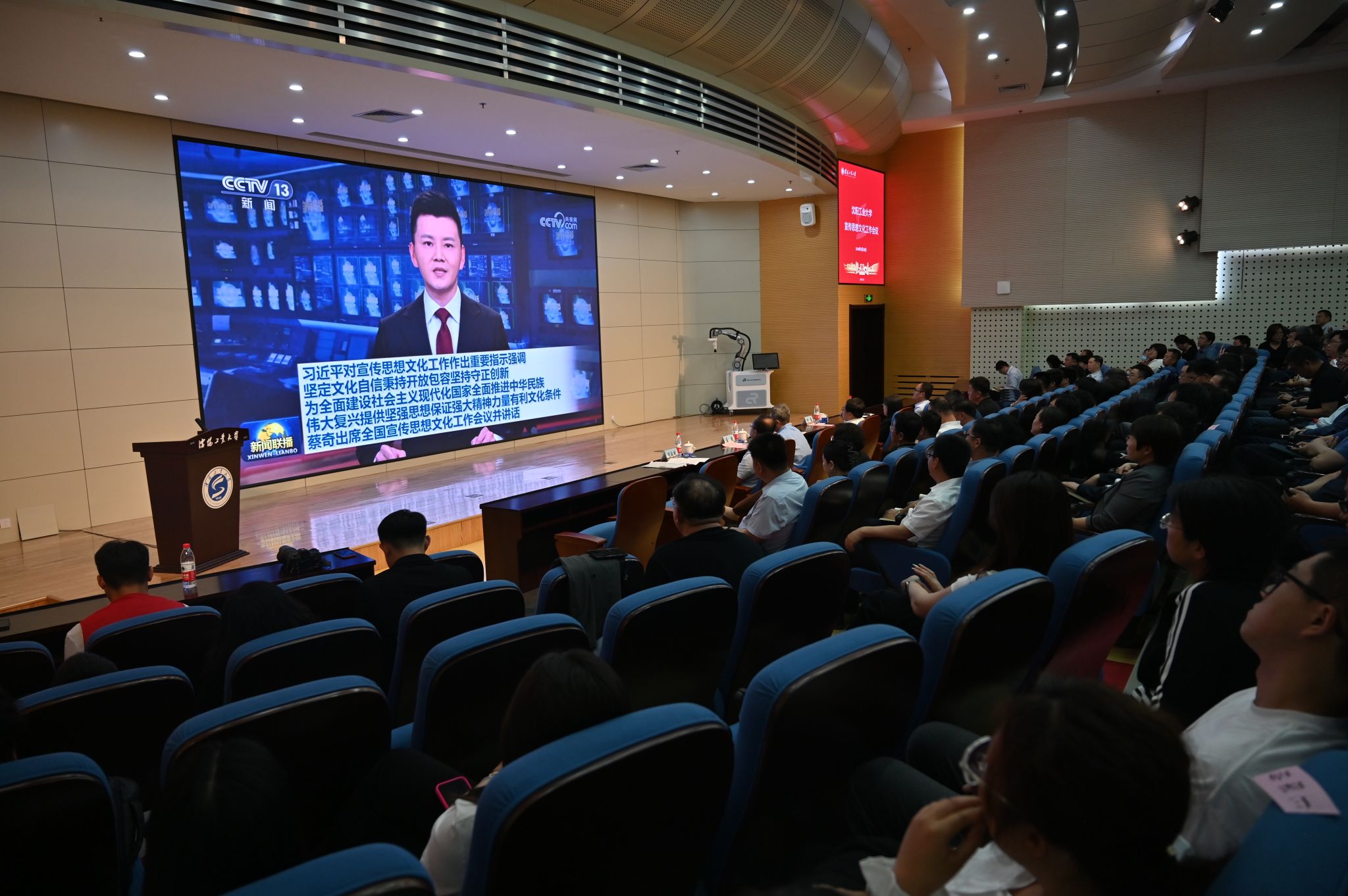 为深入学习贯彻习近平文化思想,落实学校第十三次党代会关于实施“文化浸润工程”的部署要求,5月30日,学校在中央校区科学会堂召开宣传思想文化工作会议。校党委书记贾玉明出席会议并讲话。党委常委、副校长聂鹏、陈延明、柯丽、臧喜民出席会议。全校中层正职干部,各学院党组织副书记兼副院长、团委书记、师生代表300余人参加会议。陈延明主持会议。