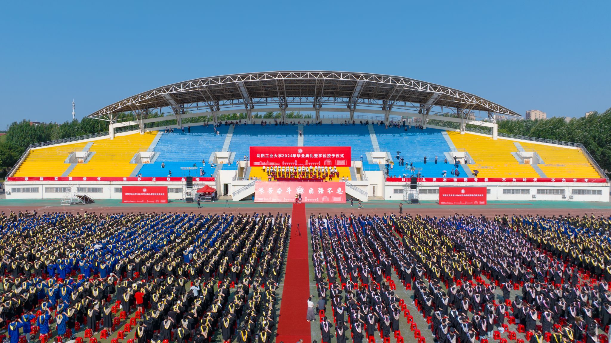 骊歌唱响,青春起航。6月19日上午,江南娱乐2024届学生毕业典礼暨学位授予仪式在中央校区南区体育场隆重举行。校党委书记贾玉明,党委常委、副校长聂鹏、陈延明、柯丽、孙秋野、臧喜民,学位评定委员会全体成员、相关职能部门和二级学院负责同志,教师代表、家长代表,2024届全体毕业生和毕业生辅导员共同见证这一庄严难忘的时刻。毕业典礼由陈延明主持。