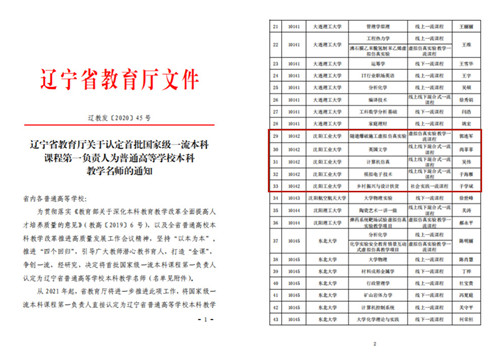 近日,辽宁省教育厅发布了《关于公布2020年辽宁省普通高等学校本科教学名师遴选结果的通知》,我校罗丹程、何立国、牛连强三位教师喜获“辽宁省普通高等学校本科教学名师”称号。辽宁省教育厅另发布了《关于认定首批国家级一流本科课程第一负责人为普通高等学校本科教学名师的通知》,我校郭连军、尚菲菲、吴伟、于海雁、于学斌五位教师作为首批国家级一流本科课程第一负责人被认定为“辽宁省普通高等学校本科教学名师”。至此,我校2020年共有八位教师获得“辽宁省普通高等学校本科教学名师”称号。