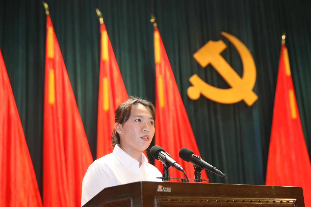 优秀党务工作者代表、管理学院学生第一党支部书记陈蕊分享了自己的党支部建设工作经验,她表示,在迎接建党百年的神圣时刻,愿身配徽章,以芳华立誓,忠于党旗前,无悔誓言句,将“不忘初心、牢记使命”扛在肩上、刻在心中、落在行动上!