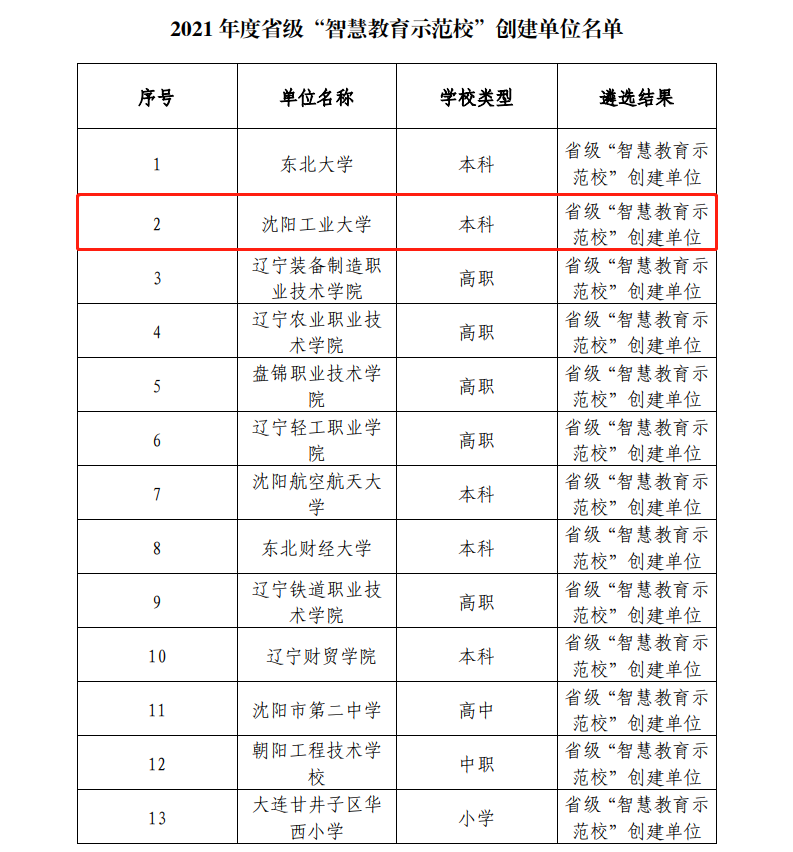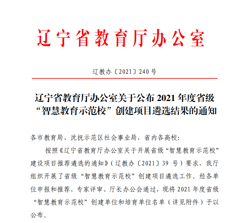 近日,辽宁省教育厅公布2021年度省级“智慧教育示范校”创建单位名单,这是我省首次实施的省级“智慧教育示范校”建设项目。经各单位申报和推荐、专家评审、厅长办公会通过,共遴选确认25家省级创建单位、15家省级培育单位,我校成功入选,以全省第二名获批省级“智慧教育示范校”创建单位。