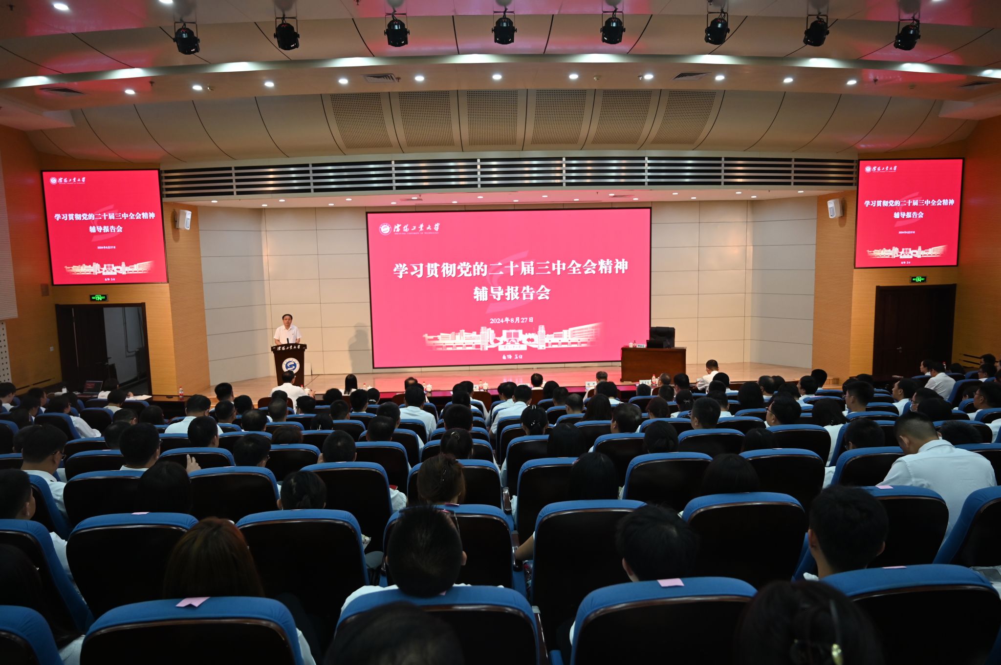 8月27日,学校在科学会堂举办学习贯彻党的二十届三中全会精神专题辅导报告会,省委宣讲团成员、省委党校(辽宁行政学院、省社会主义学院)分管日常工作的副校长(副院长)邓泉国教授应邀作辅导报告。党委书记贾玉明主持会议,党委副书记、校长张珂,党委常委、副校长陈延明,党委常委、纪委书记、监察专员陈卫国,党委常委、副校长柯丽、臧喜民、夏明超出席会议。沈阳校区中层干部、基层党支部书记、组织员、师生党员代表近400人在现场参加报告会,辽阳分校近百名师生通过视频方式参会。