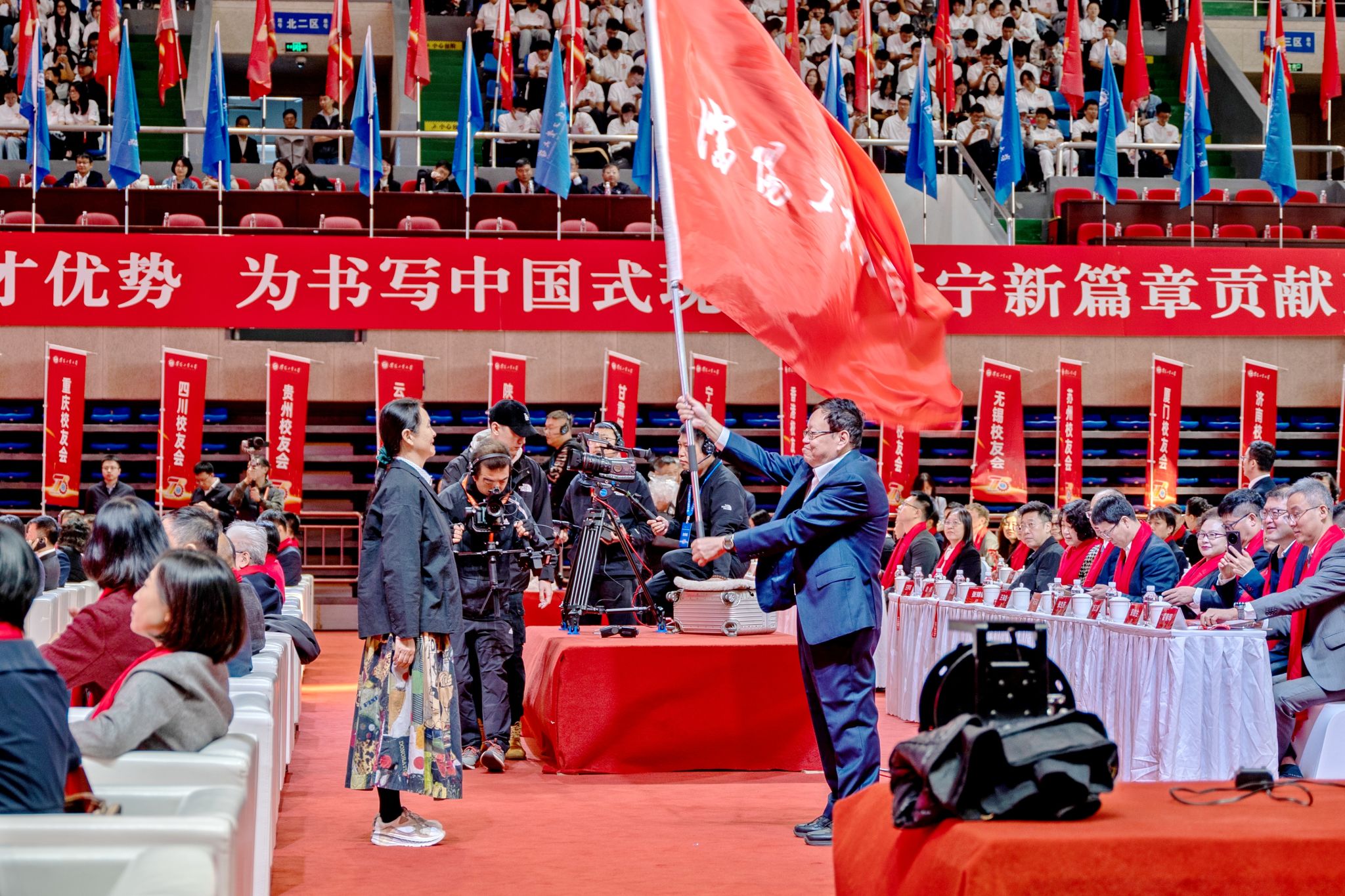 大会在校旗传递仪式中拉开帷幕。校旗传递活动历时一年时间,传递了45个校友会,环游亚洲、欧洲、大洋洲、北美洲和国内北京、上海、广州、深圳、天津、成都、长春等40余个城市,最后传回学校,传到大会现场,经由院士增选有效候选人杨理践教授、全国模范教师林莘教授的接力传递,最终交给党委书记贾玉明。贾玉明书记挥舞校旗,与全体工大人共同见证学校75周岁生日的荣耀时刻。