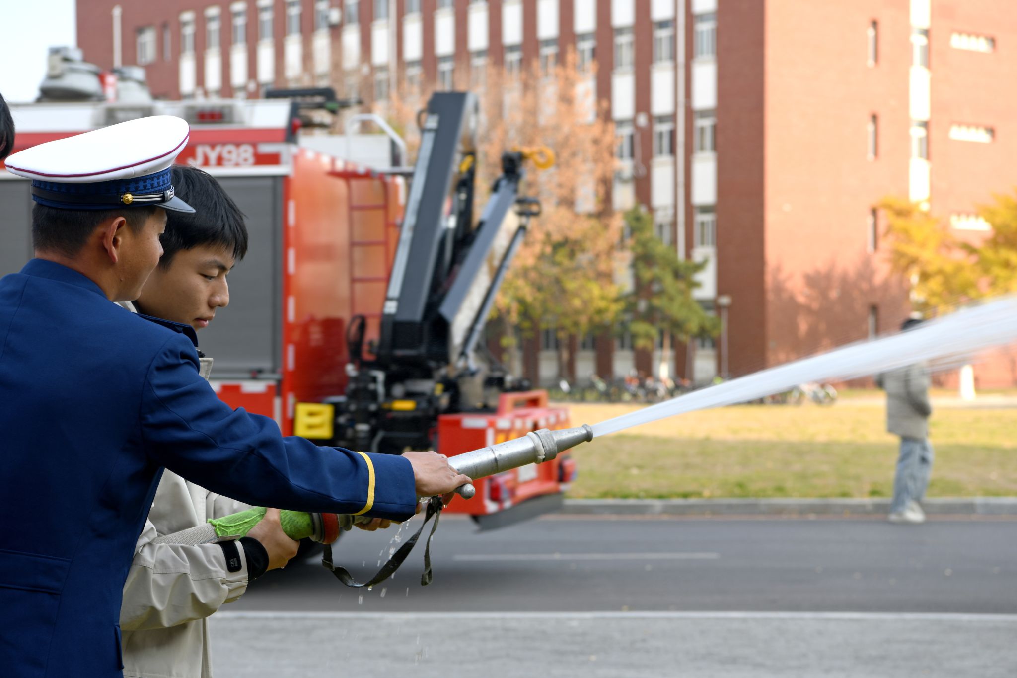 现场紧急情况解除后,消防人员向同学们讲解了火灾逃生时的应急处置方式和求救技巧,并现场演示消防服试穿、高压水枪、灭火器等消防器材的使用方法。各学院学生代表、教职工代表及物业服务人员参与了灭火器实际操作演练,通过实操演练加深掌握了灭火器的使用方法及初起火灾扑救、逃生的要领。