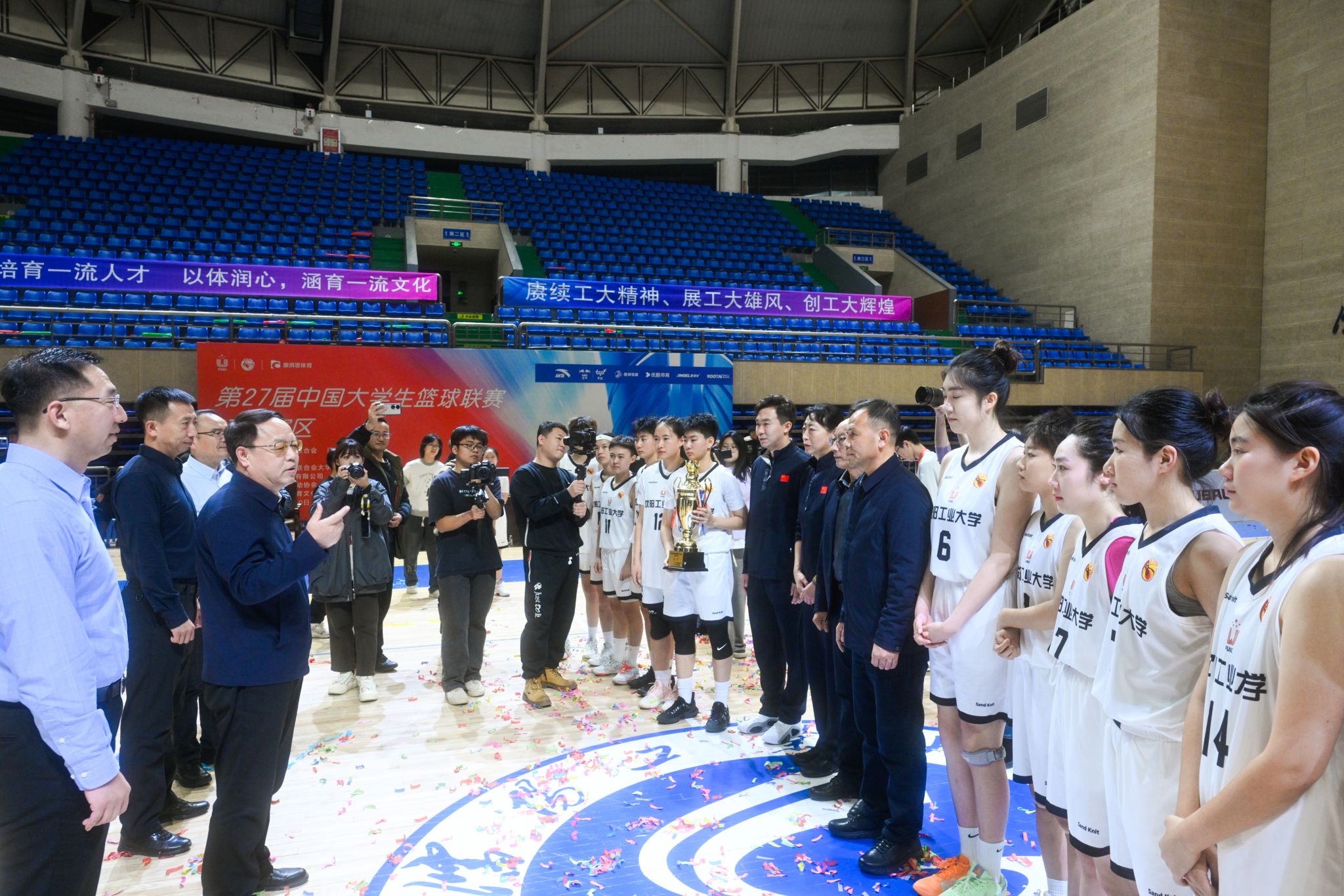 赛后,贾玉明书记第一时间来到球队中间与队员共同庆祝这一荣耀时刻。他对女子篮球队取得的优异成绩表示热烈祝贺,对成绩背后运动员、教练员等工作人员的辛勤付出表示衷心感谢。他一一点评了赛场上队员们的表现,并用“不容易”“了不起”“好样的”三个词高度评价了队员们精湛的竞技水平和精诚团结、顽强拼搏的进取精神。他表示,队员们一路披荆斩棘、齐心协力,用努力和拼搏纵贯全程,成就胜利,以实际行动诠释了“自强 笃行”的校训,展现出工大学子笃定前行,奋勇争先的精神风貌,不仅为江南娱乐赢得了荣誉、增添了光彩,更为全校学子作出了示范和表率,给全校师生带来了巨大的鼓舞和激励。他勉励队员们继续勇攀高峰,在全国总决赛中再接再厉,再创佳绩。