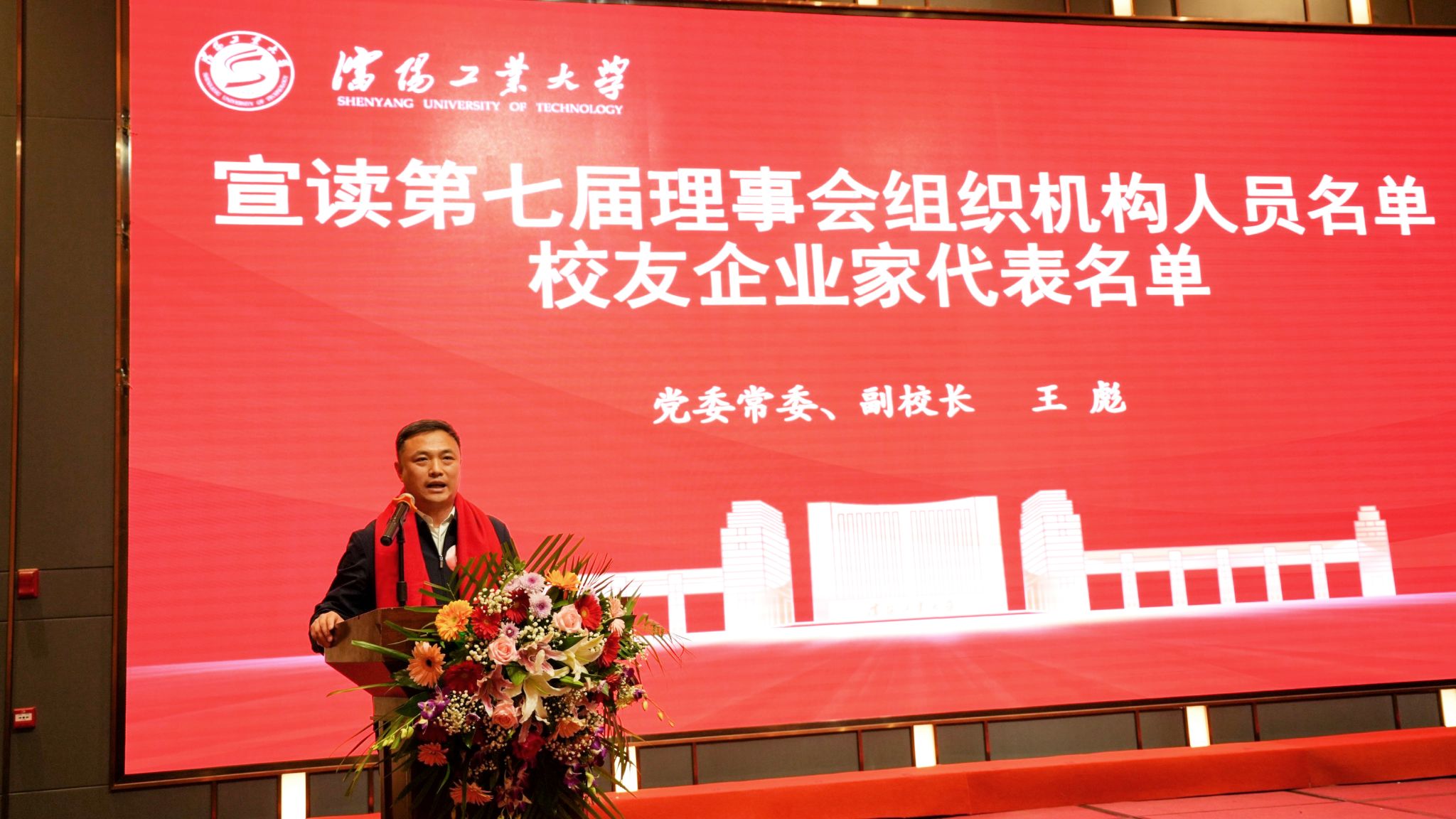 王彪宣读沈阳校友会第七届校友理事会组织机构成员名单和新聘江南娱乐校友服务辽宁高端装备制造业发展研究院校友企业家名单。