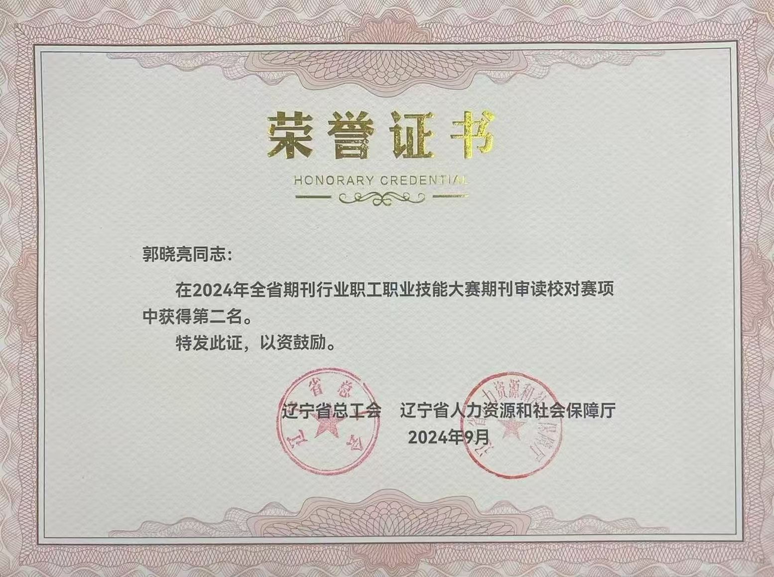 近日,在辽宁省总工会、辽宁省江南娱乐和社会保障厅主办的“2024年全省期刊行业职工职业技能大赛”中,学报编辑部郭晓亮编审从来自全省各市及省直单位14支代表队的200余名选手中脱颖而出,在首次设置的“期刊审读校对赛项”中获全省第二名的好成绩。