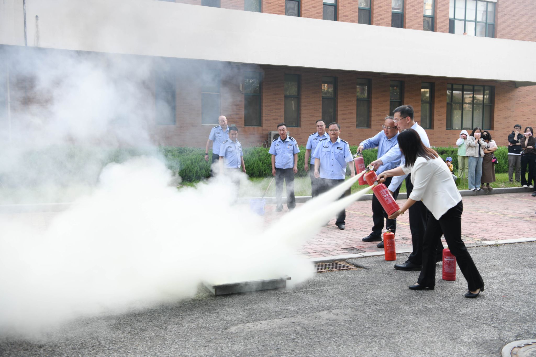 随后,校部办公楼全体工作人员进行了消防应急疏散演练。演练模拟火灾的扑救、控制、火场协调指挥及人员疏散引导、火场警戒等情景,现场人员亲身体验火灾逃生路线、逃生方法。随着演练人员点燃红色报警烟雾弹,楼内报警铃声迅疾响起,消防应急广播反复播放紧急撤离提示,行政楼内教职员工开始快速有序疏散。在集合清点人数过程中,现场急救医护人员同步进行心肺复苏急救演示讲解。报告人员疏散总数后,工作人员详细介绍了应急疏散逃生注意事项并现场演示讲解了灭火器的操作要领。最后参加演练人员分批使用干粉灭火器进行了灭火实战操作。