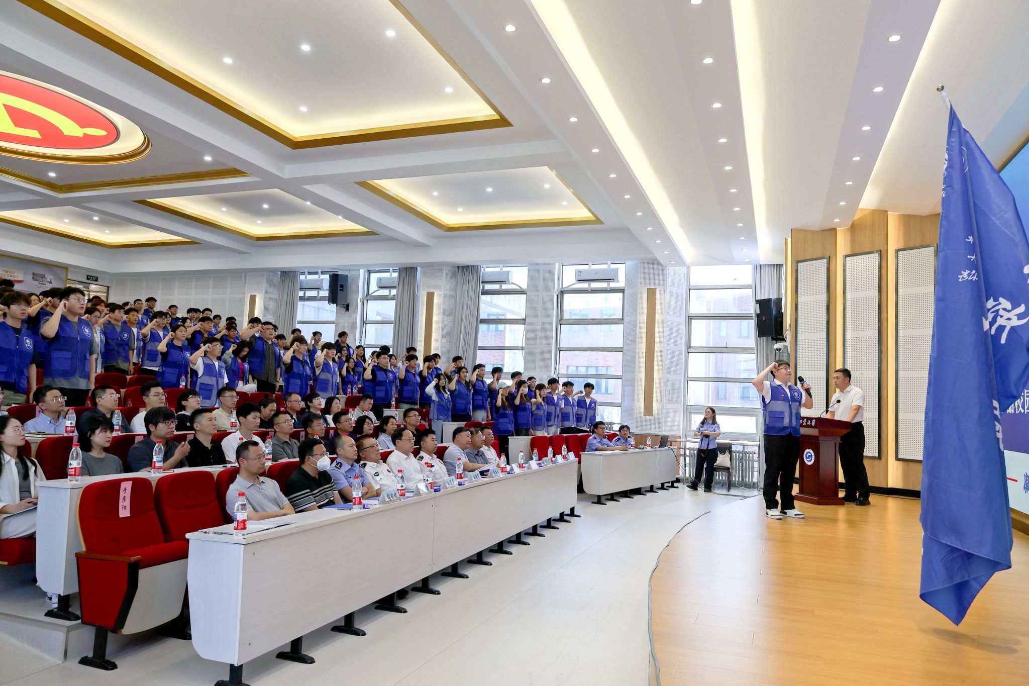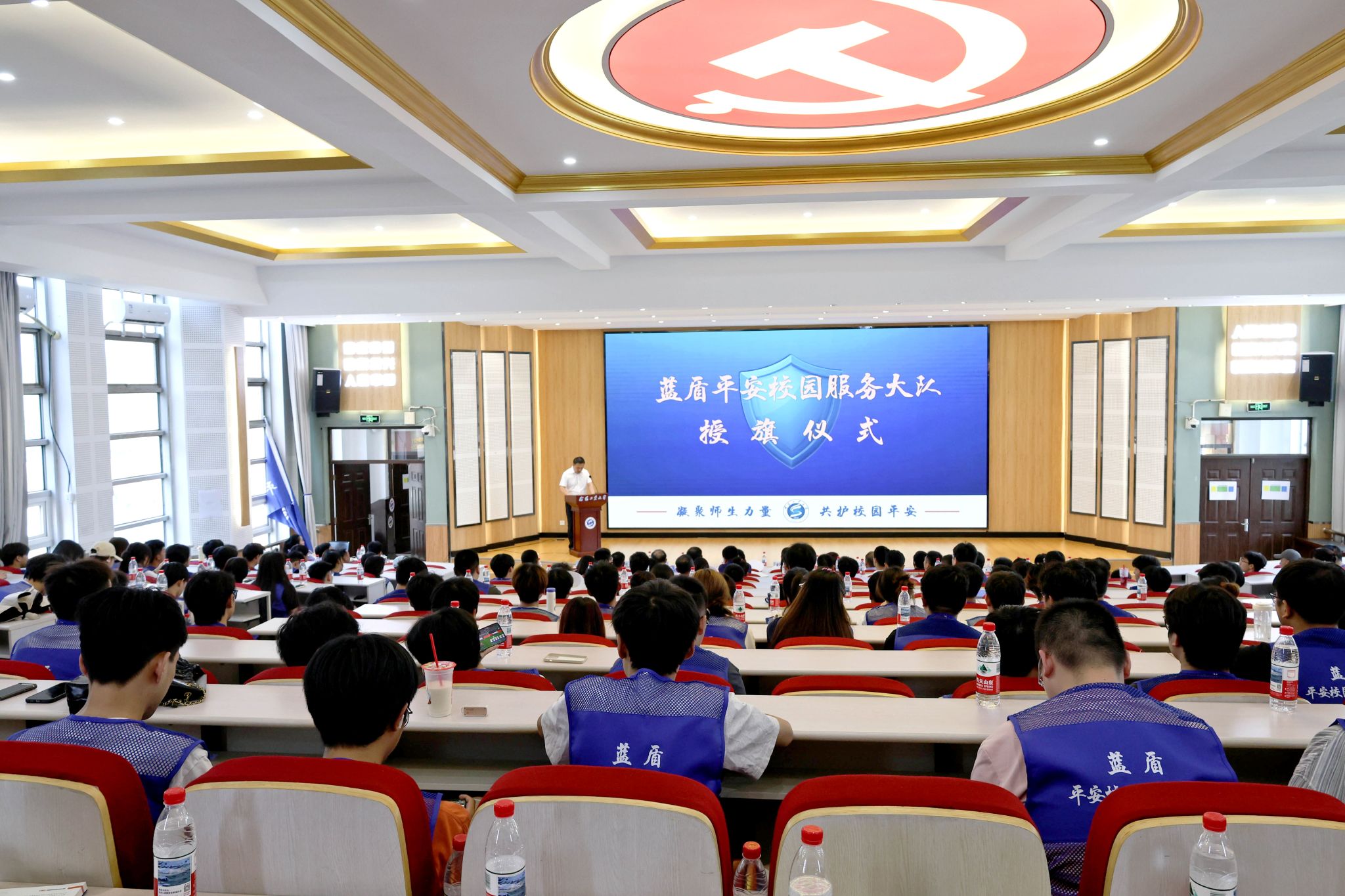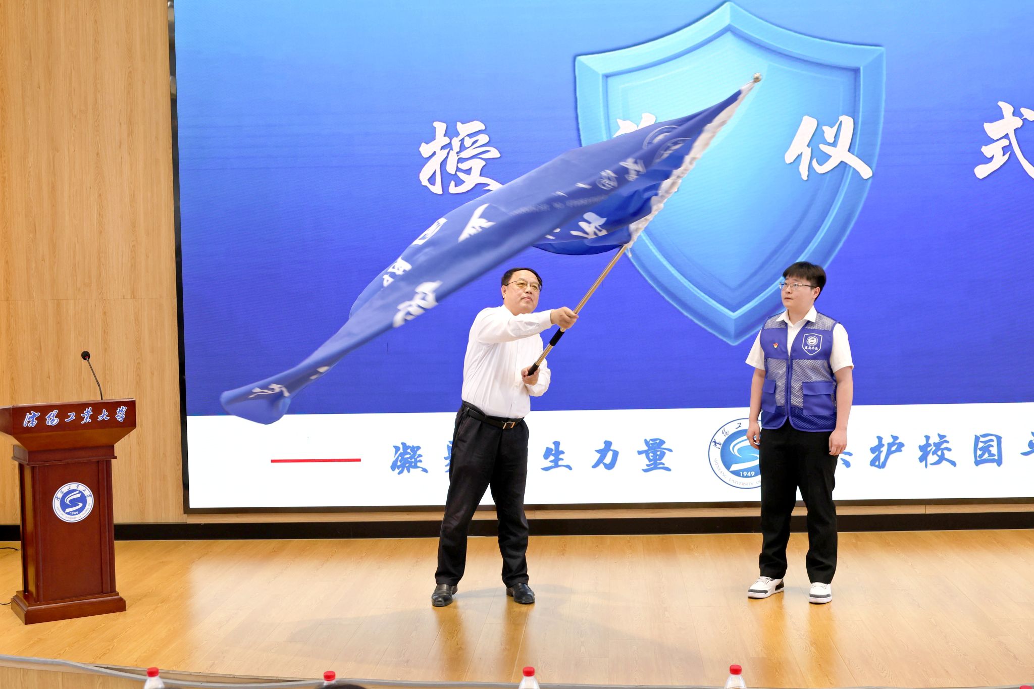 贾玉明为蓝盾平安校园服务大队授予队旗,强调了蓝盾平安校园服务大队队员作为学校团学组织骨干在深化平安校园建设中应发挥的作用,对队员们提出四点期望。一是成为安全知识的“宣传队”。要坚持教育为先、引导为要,聚焦师生生命财产安全与身心健康防护,运用身边典型案例和学生喜闻乐见的方式,积极传播政策性、专业性、技术性安全知识,全面提升师生安全意识、防范能力和应急水平,营造“人人讲安全、事事为安全”的浓厚氛围。二是成为风险隐患的“信息员”。要练就一双慧眼,在日常学习生活中敏锐洞察潜在的安全风险隐患,构建高效灵敏的信息收集与传递网络,人人争当校园安全的“吹哨人”。时刻关注消防、食品、交通、心理等关键领域,对苗头性、倾向性问题,早发现、早报告、早处置。三是成为身边同学的“贴心人”。要以真诚关爱凝聚人心,主动调解矛盾纠纷,维护良好同学关系,做团结和谐氛围的营造者和促进派。要弘扬无私奉献精神,危难之处显身手,传递温暖与善意,争做深受同学信赖的“工大好人”。四是成为校园安全的“守护者”。要主动扛起守护校园安全的神圣职责,做好监督检查、安全提示、危机报告等工作,成为维护校园稳定的坚实力量。要在团队协作中涵育爱校情怀,提升能力本领,促进自身全面成长,以实际行动诠释“校园安全守护者”的使命担当。