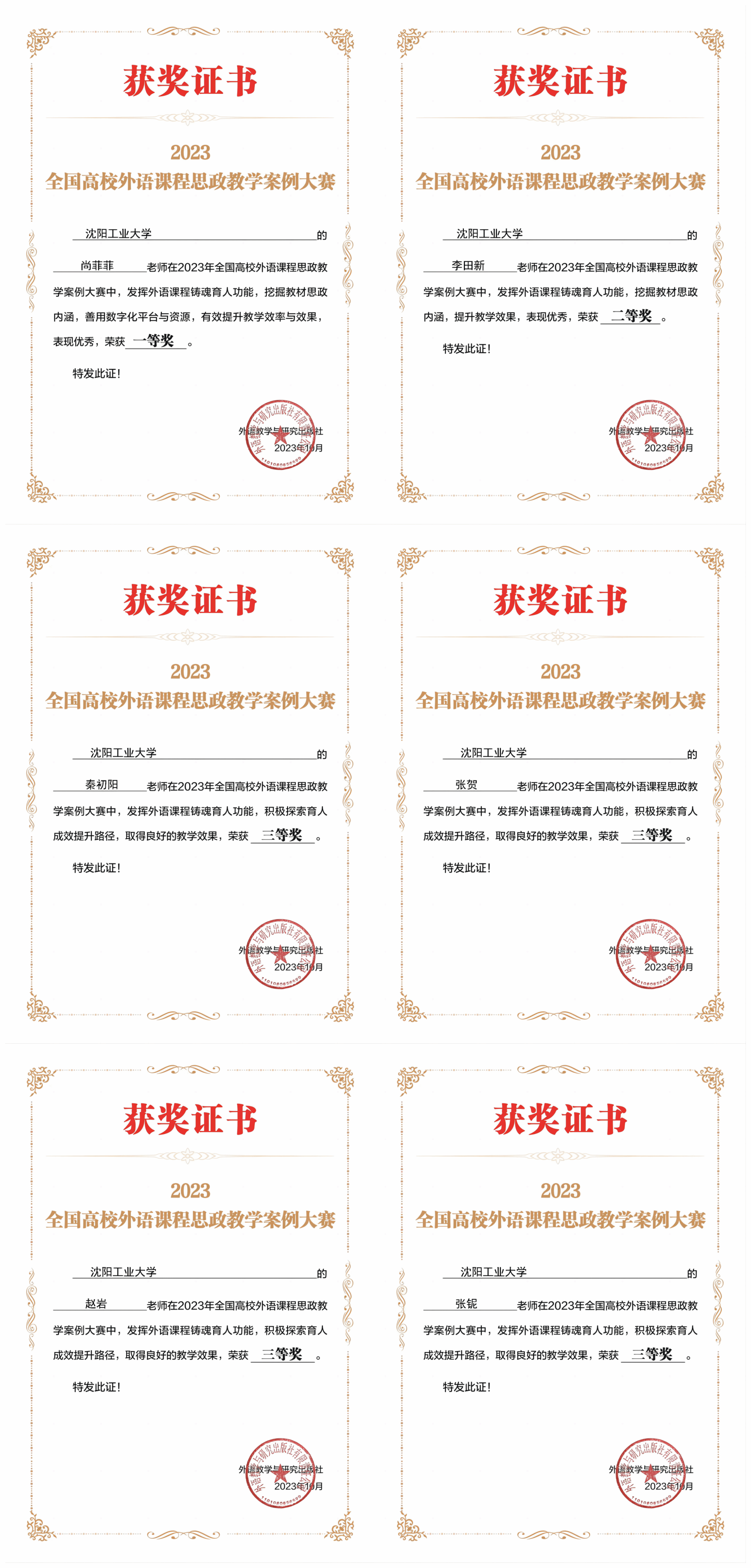 日前,我校教师在全国高校外语课程思政教学案例大赛中获得一等奖1项、二等奖1项、三等奖4项。其中尚菲菲荣获一等奖,李田新荣获二等奖,秦初阳、张贺、张铌、赵岩荣获三等奖。该项赛事由外语教学与研究出版社发起,旨在通过搭建全国性的沟通交流课程思政育人实践的赛事平台,全面提升课程思政建设深入性、创新性与有效性,助力高校服务国家战略、培养新时代所需的高素质外语人才。此次成绩的取得是我校落实立德树人根本任务,服务国家对外话语体系建设和国际传播能力建设,全面提高人才培养质量的重要体现。