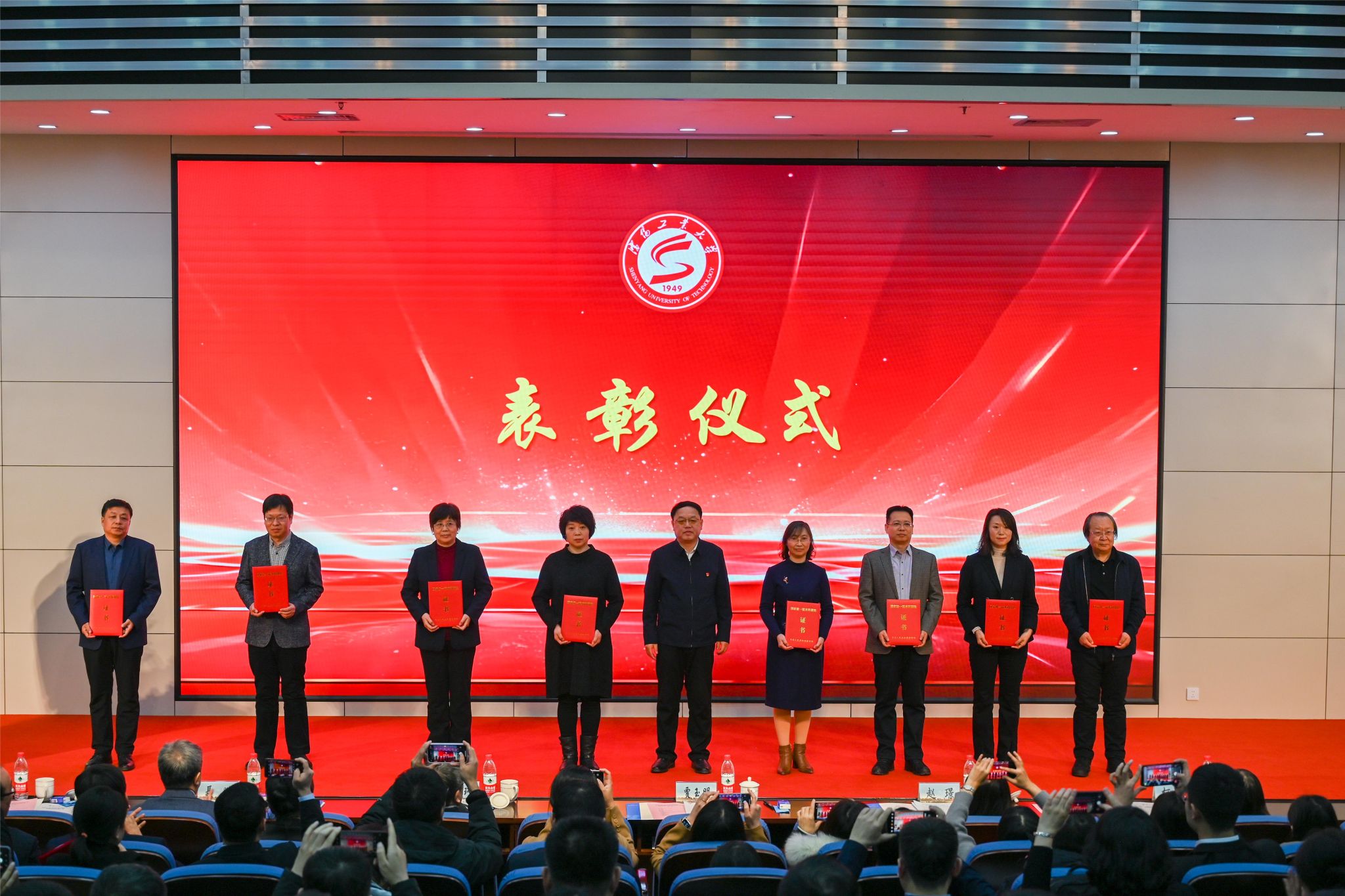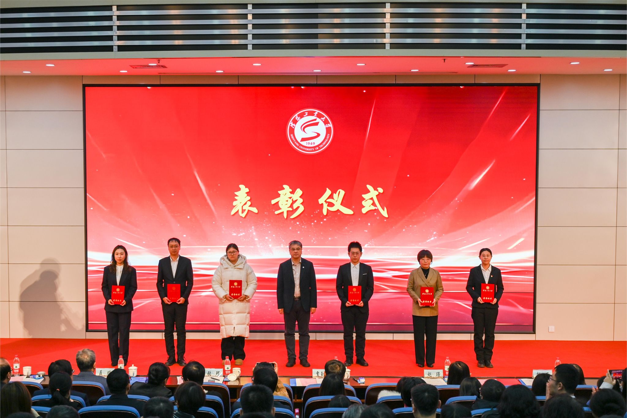 大会对2023年以来获得本科教育教学相关荣誉的集体和个人进行了表彰,党委副书记赵璟宣读表彰文件,校领导分别为获奖者颁奖并合影留念。