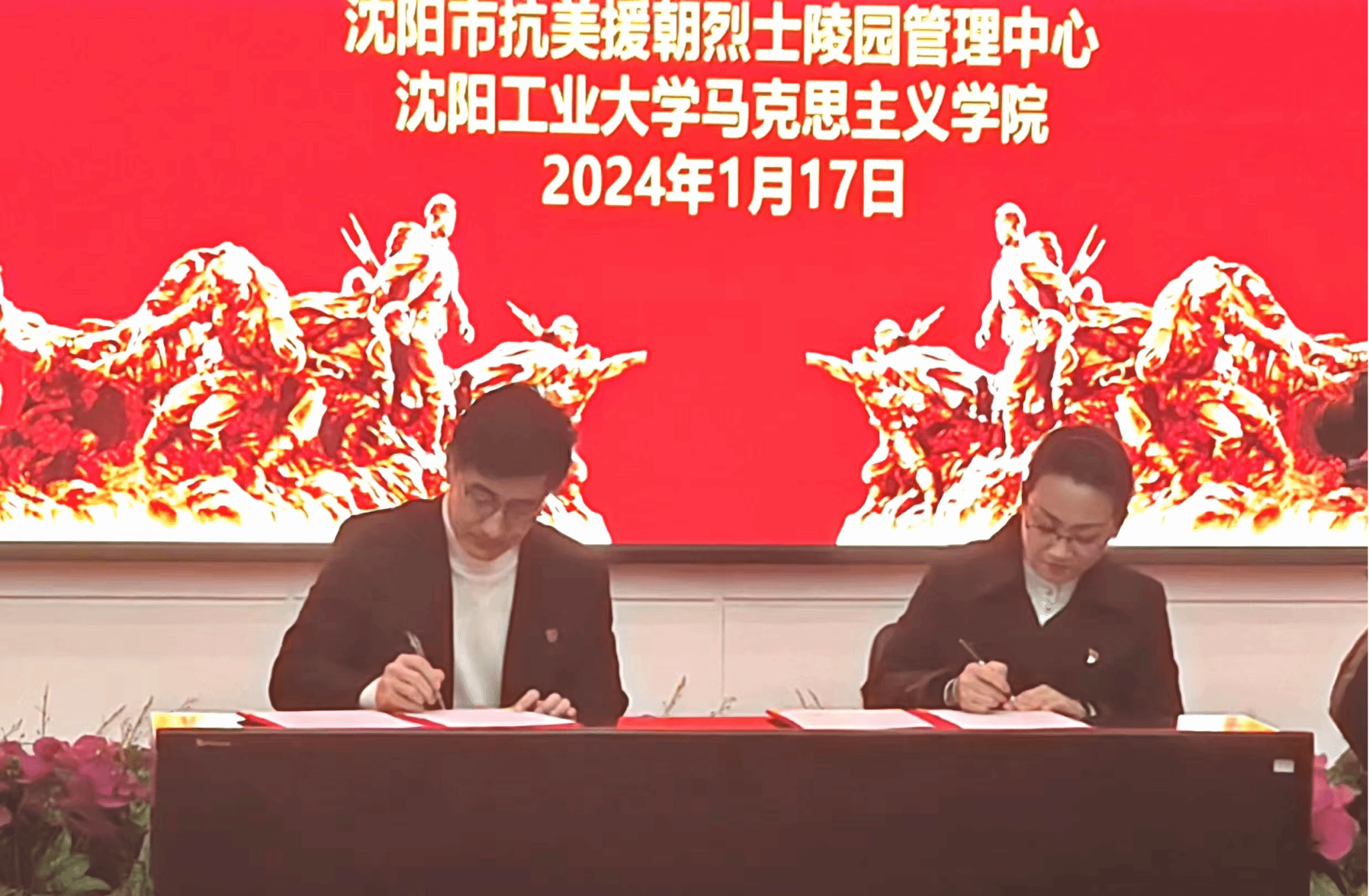 仪式中,沈阳市抗美援朝烈士陵园管理中心主任吴涛与江南娱乐马克思主义学院党总支书记曲弋代表馆校双方共同签署共建共育教育基地合作协议书,并共同为“沈阳抗美援朝烈士陵园、江南娱乐马克思主义学院共建共育教育基地”揭牌。