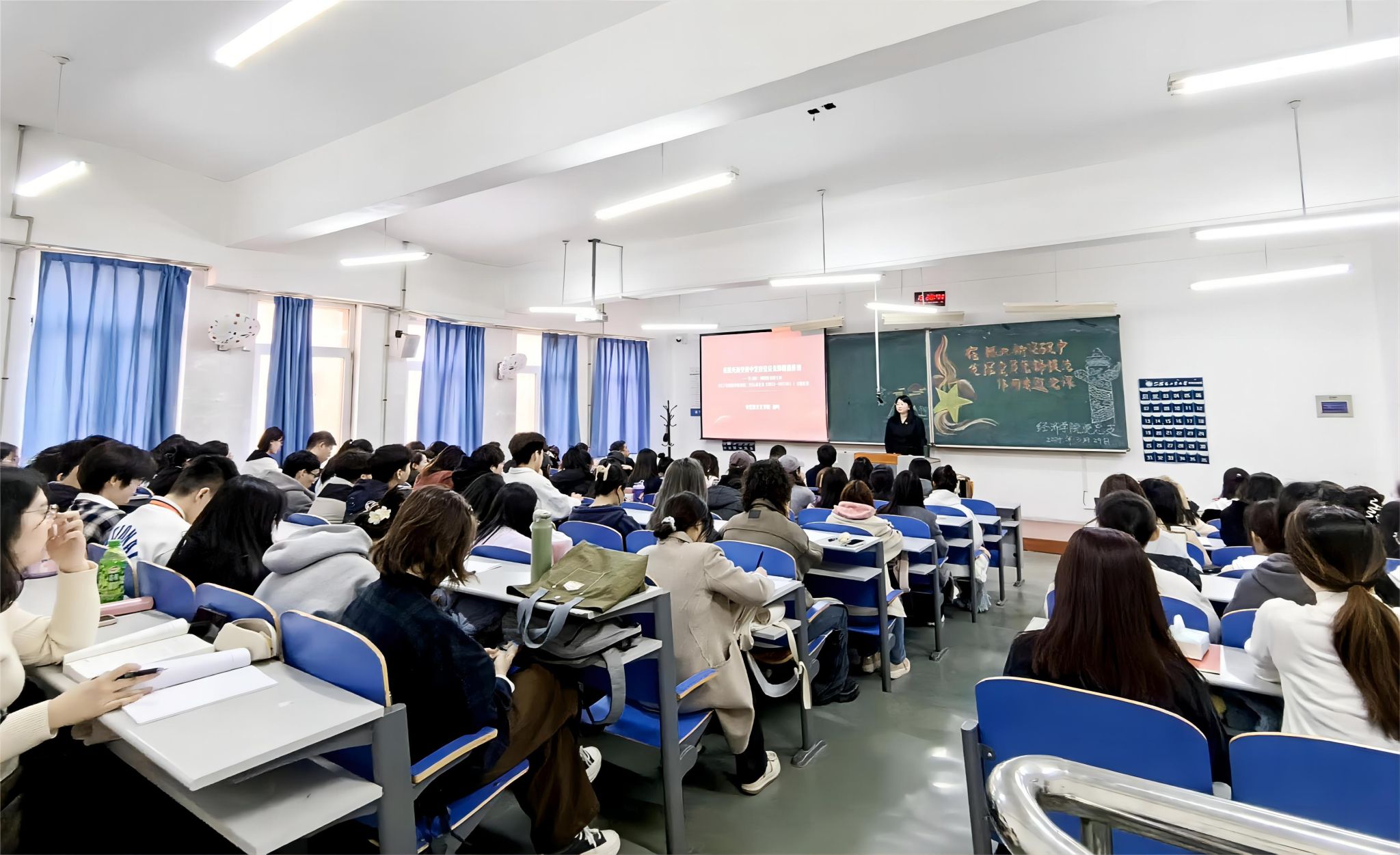 党课开始前,经济学院党总支书记付博文对组织本次专题党课的背景、目的和意义作了详细介绍,对全体党员和入党积极分子深入学习领会党课内容并付诸行动提出具体要求。接着,柳叶老师从辽宁新时代“六地”提出的背景引入,以历史选择辽宁和辽宁选择未来两大方面细致地讲解了辽宁“红色六地”和辽宁新时代“六地”的内涵,让师生们明确了辽宁新时代“六地”的目标定位,也进一步深刻领悟新时代“六地”所延续的辽宁人不忘初心、砥砺奋进的精神血脉,及其所充分彰显的以“辽宁之为”服务“国之大者”的使命担当,她通过介绍学校服务辽宁全面振兴新突破三年行动计划和举措,让师生们对如何服务辽宁全面振兴,如何发挥先锋模范作用有了更深入的思考。