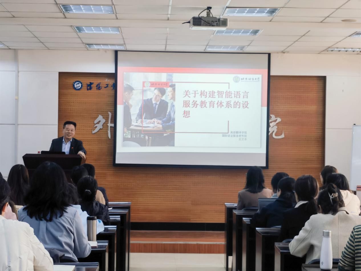在外国语学院419会议室,王立非教授首先做了题为“关于构建智能语言服务教育体系的设想”的学术报告。通过回顾国内外语言服务产业发展现状,王立非教授提出了语言服务全面进入新质生产力时代,论述了“智能语言服务”和“智能语言服务教育”的概念和内涵,以及如何构建智能语言服务的课程体系来提升外语类专业和学科服务国家战略需求和经济社会发展的能力。外国语学院全体教师及部分学生代表聆听了讲座。