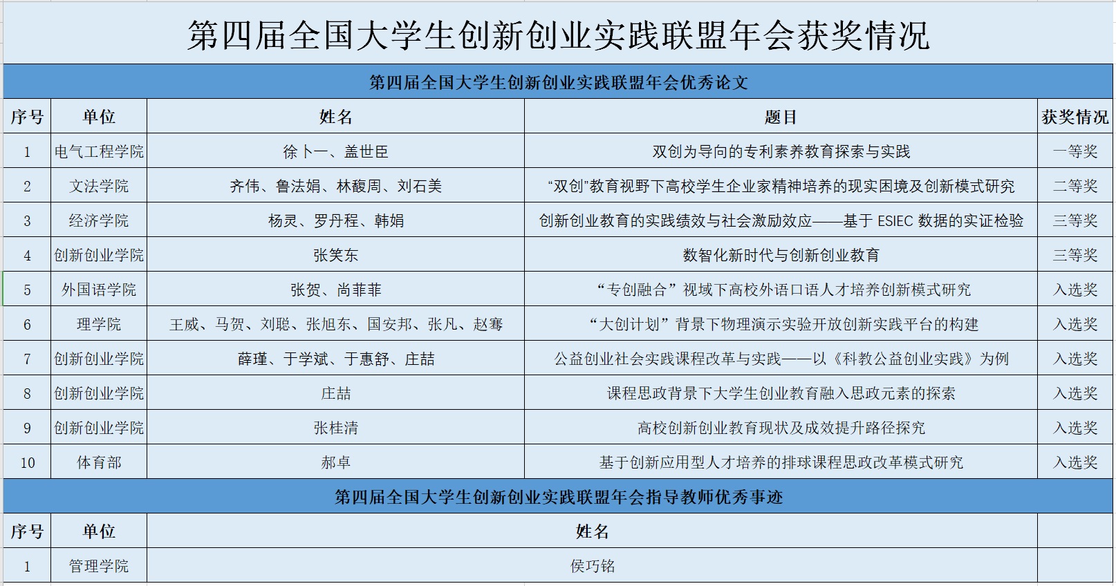 近日,第四届全国大学生创新创业实践联盟年会公布征集作品获奖名单,我校推选的论文获一等奖1篇(共25篇),二等奖1篇、三等奖2篇,入选奖6篇,指导教师优秀事迹1人。