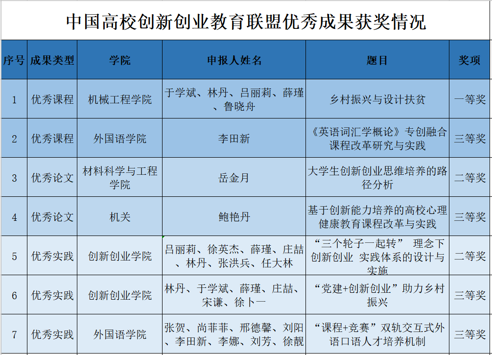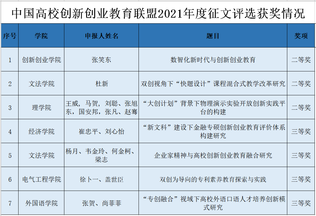 近日,在中国高校创新创业教育联盟举办的优秀成果征集和2021年度征文评选两项活动中,我校均获得优秀组织奖。在优秀成果征集评选中,获一等奖1项、二等奖3项、三等奖3项;在征文评选活动中,获二等奖3篇,三等奖4篇。