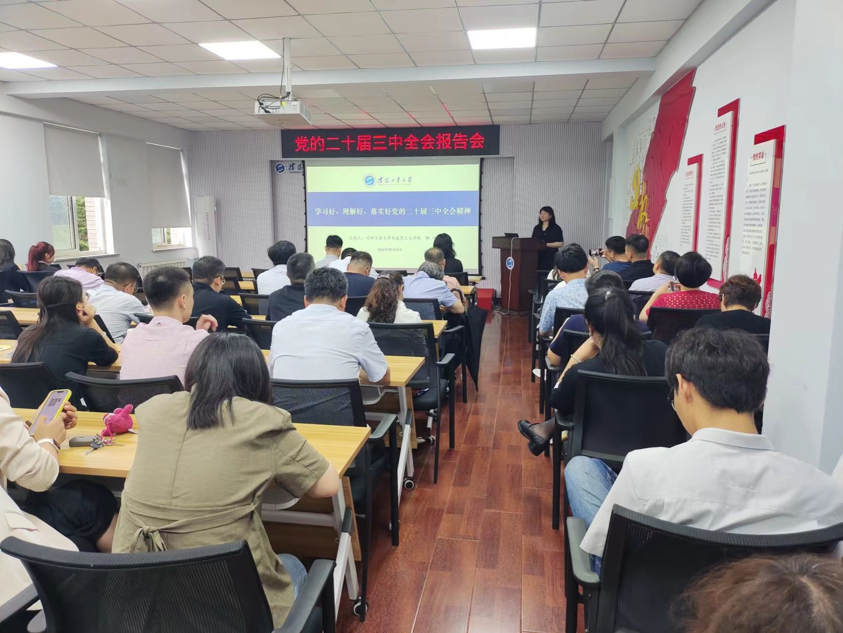 柳叶以《学习好、理解好、落实好党的二十届三中全会精神》为题作学习贯彻党的二十届三中全会精神专题报告。报告对党的二十届三中全会精神进行了全面系统的阐释,从党史上历届三中全会到党的二十届三中全会的基本框架和主要内容,她用鲜活事例和详实数据,对全会精神做深入解读,指出贯穿历届三中全会关键词为改革、制度、经济。全会最重要的成果是审议通过《中共中央关于进一步全面深化改革、推进中国式现代化的决定》。《决定》对深化教育科技人才体制机制一体改革作出了重要部署,涉及人才培养、学生实习实践制度等与学院发展密切相关内容。