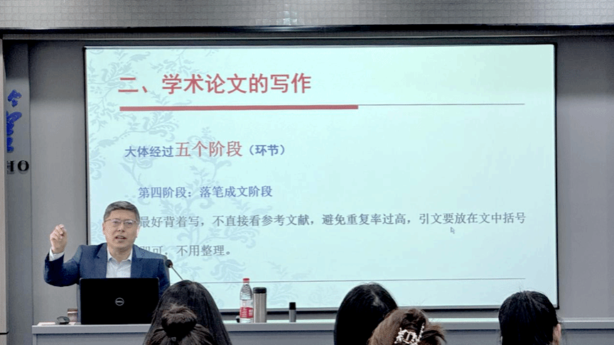 丁春福教授结合自身丰富的发表文章和指导学生写作经验,从学术论文选题、写作、投稿以及学位论文选题与写作四个方面,用生动的案例和通俗易懂的语言进行了系统讲解。他提出论文写作应经过写作冲动、收集资料、拟定论文框架、落笔成文和反复推敲五个阶段。并强调论文选题的重要性,建议选题应遵循问题意识,题目表述宜新颖直白。他认为在学术论文投稿环节,应以“投其所好”为原则,根据不同学术期刊的定位、办刊宗旨、读者群体以及审稿流程等,选择合适的投稿目标,提高论文录用率。同时,他也提醒大家在投稿过程中要注意遵循学术规范,避免一稿多投等学术不端行为。最后,针对研究生学位论文的选题与写作,他也做了专门讲解。
