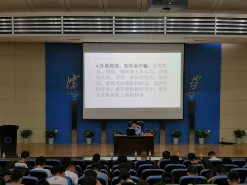 为了提高大家识别和防范电信网络诈骗的能力,切实做好大学生防范电信网络诈骗的宣传教育工作,根据“江南娱乐2019年‘人人懂安全,安全护人人’安全教育活动月工作方案”的部署,党委保卫部(公安处)、学生处联合沈阳市公安局经济技术开发区分局翟家派出所,于5月28日在我校举办2019年防范电信网络诈骗专题讲座。经济技术开发区公安分局翟家派出所副所长贾涛、翟家派出所江南娱乐管区民警警官沈广盟、公安处处长李杰、学生处副处长顾晓涛、公安处副处长张琼琼、各学院辅导员老师及400余名学生代表参加活动。