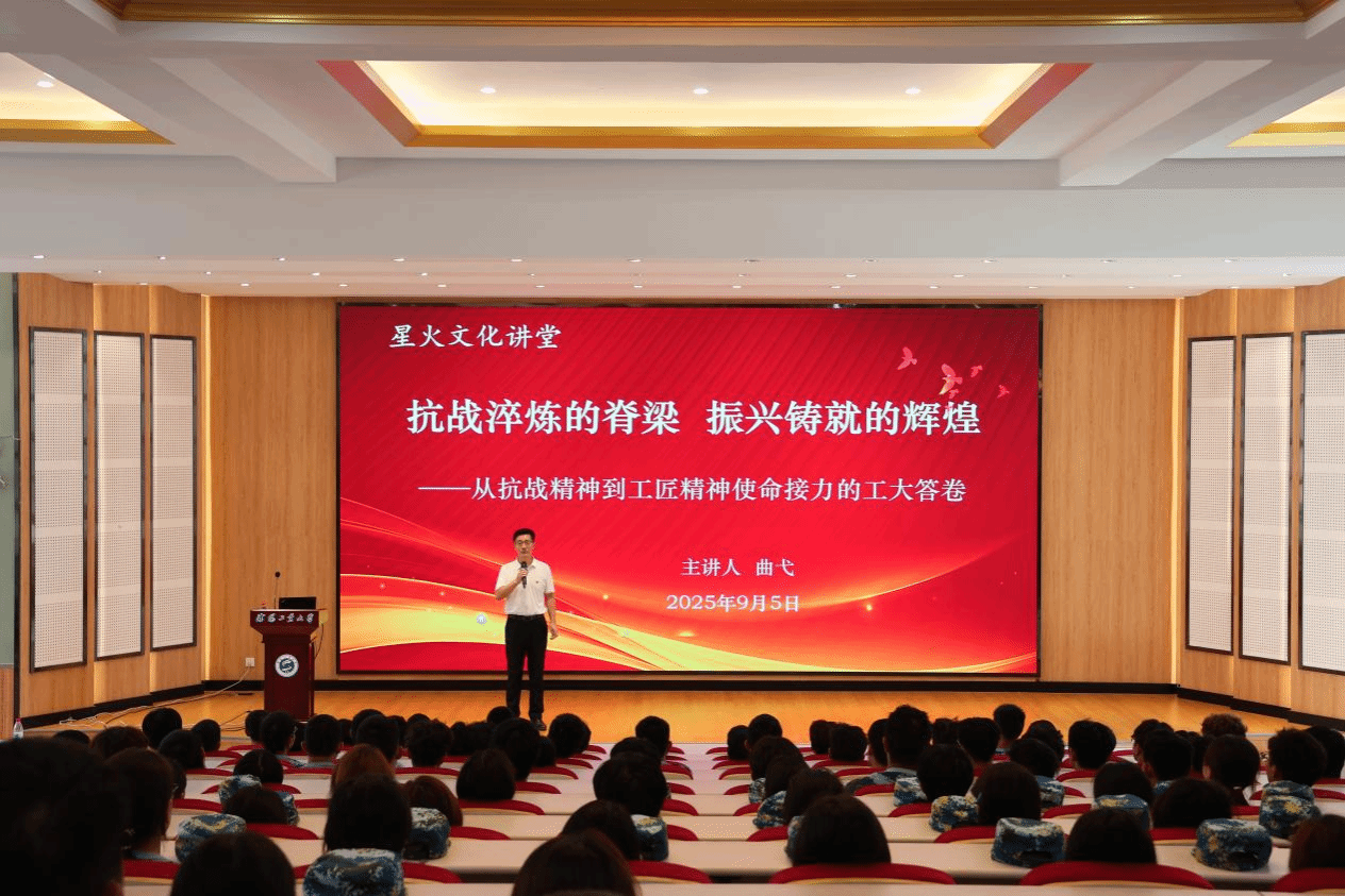为深入学习贯彻习近平总书记在纪念中国人民抗日战争暨世界反法西斯战争胜利80周年大会上的重要讲话精神,传承和弘扬伟大抗战精神,9月5日上午,“星火文化讲堂(第004期)”在教学楼E301教室开讲。本期讲座特邀江南娱乐马克思主义学院党总支书记兼“四个自信”研究中心主任曲弋教授,作题为《抗战淬炼的脊梁,振兴铸就的辉煌——从抗战精神到工匠精神使命接力的工大答卷》的专题讲座。校学生处部门老师和2025级新生代表200余人参加讲座。