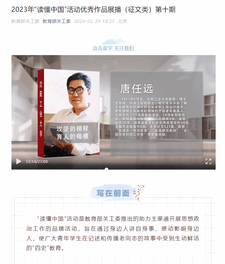近期,教育部关工委2023年“读懂中国”活动征文讲述类优秀作品正在展播中,我校报送的唐任远院士征文作品作为辽宁省属高校唯一入选。