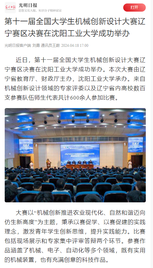 据悉,本次大赛为广大学子提供了一个展示创新成果、交流学术思想的平台。此次比赛展现了辽宁省大学生的卓越才华,展示了机械创新设计的最新动态和发展趋势,激发了学生参与创新活动的热情,提升了学生创新实践的能力,为创新型人才的培养奠定了良好的基础。(光明日报全媒体记者刘勇 通讯员王蔚)