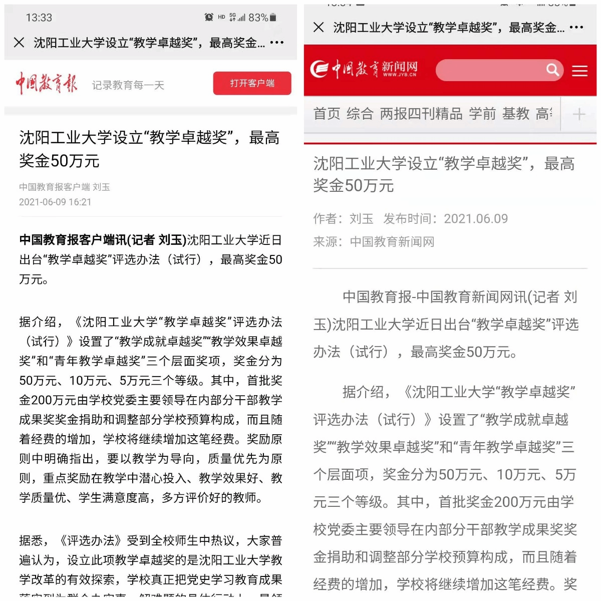 6月9日,中国教育新闻网以“江南娱乐设立‘教学卓越奖’,最高奖金50万元”为题报道了我校“教学卓越奖”。同时,中国教育报客户端也于6月9日对此奖项进行报道。