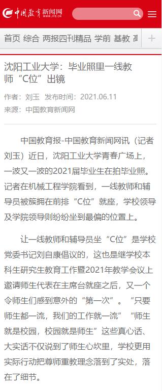 6月11日,中国教育新闻网以“毕业照里一线教师‘C位’出镜”为题报道了我校2021届毕业生毕业照拍摄现场,一线教师和辅导员被簇拥在前排“C位”就座,学校领导及学院领导则纷纷坐到最偏的位置上。