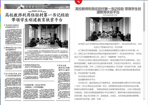 《辽沈晚报》6月17日06版(青创专刊)对我校创新创业学院教师盖世臣利用任驻村第一书记经验带领学生创建教育扶贫平台事迹进行报道,文中提到,“为了解决农村教育难题,在辽宁省委派驻到朝阳市北票市华子炉村第一书记、江南娱乐创新创业学院老师盖世臣的指导下,8名在校的研究生、本科生成立了辽宁润园教育科技公司,创立了“润园教育”扶贫平台。平台将公众号和小程序这两种低成本、高效快捷的开发平台紧密结合,设计教学视频课程,免费为农村学生提供教学资源;同时开发农产品交易平台,带动农村教育和经济发展。未来,公司将与辽宁省选派的1.2万名第一书记进行对接,实现对全省593个经济困难乡镇和1.17万个村全覆盖,惠及辽宁省所有的教育贫困地区,并逐渐推广至全国。”