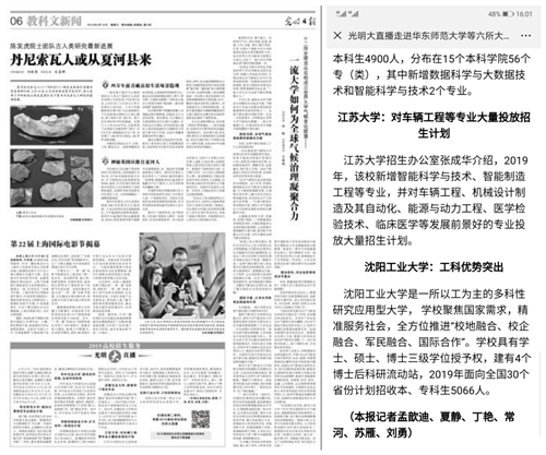 6月15日,由《光明日报》主办的“2019年高考招生服务光明大直播”媒体团队走进我校,对我校招生情况进行了时长2小时余的现场直播,并于6月16日,《光明日报》“06版教科文新闻”对我校招生概况进行报道。文中提到,“江南娱乐工科优势突出,是一所以工为主的多科性研究应用型大学,学校聚焦国家需求,精准服务社会,全方位推进“校地融合、校企融合、军民融合、国际合作。学校具有学士、硕士、博士三级学位授予权,建有4个博士后科研流动站,2019年面向全国30个省份计划招收本、专科生5066人。”我校党委宣传部、招生就业处进行了全面细致筹备和接待。
