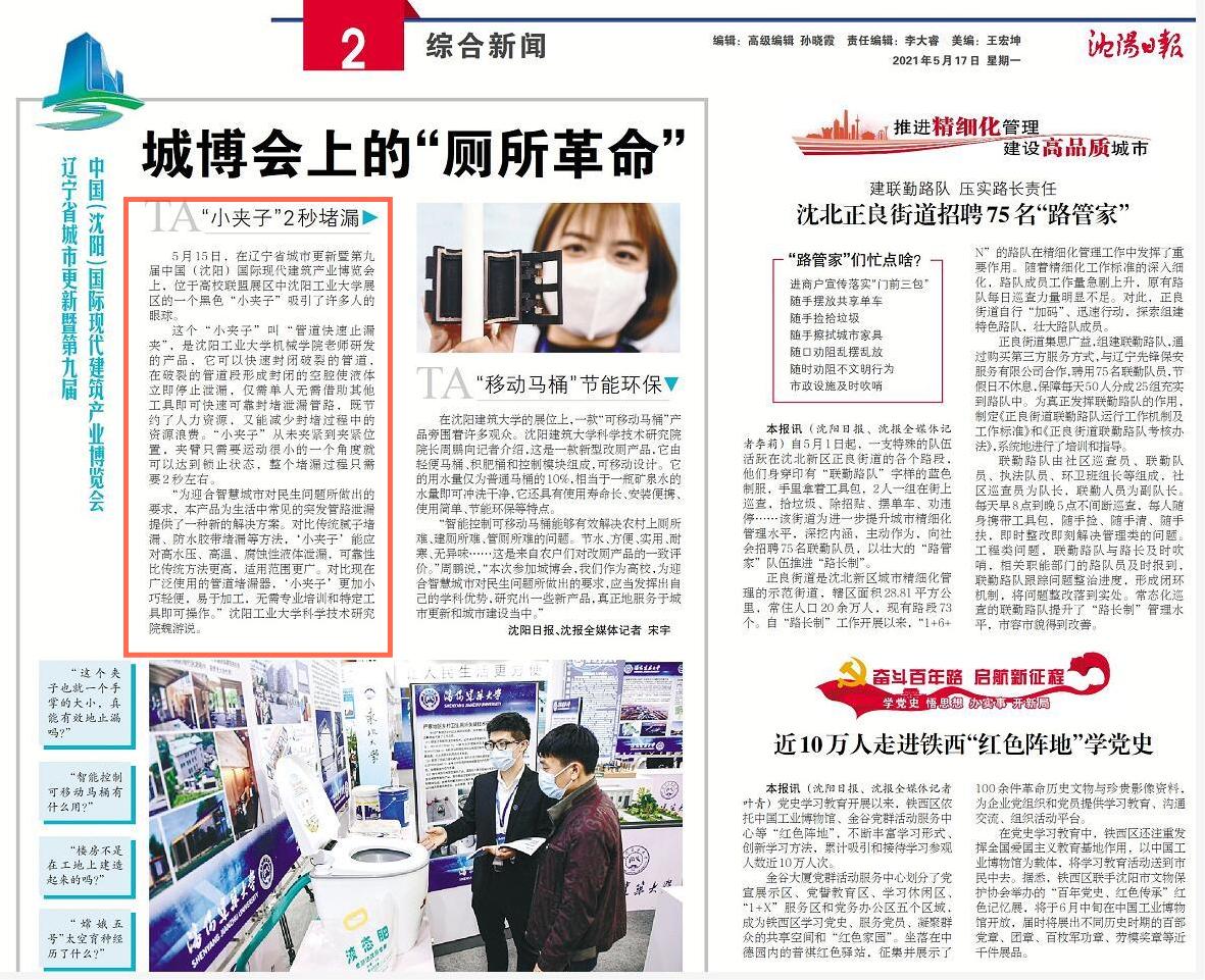 5月17日,沈阳日报报道了我校在辽宁省城市更新暨第九届中国(沈阳)国际现代建筑产业博览会上展出的一个黑色“小夹子”,充分展示了我校优秀科技创新成果。