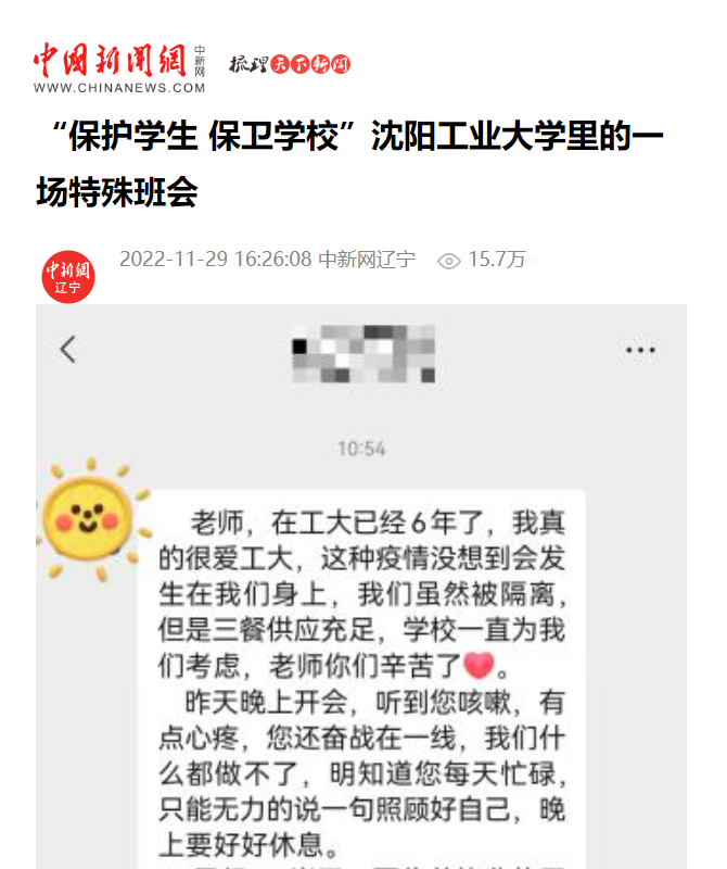 “你们抱怨的地方,我都感同身受;你们想问的问题,我都会给大家讲;你们的合理诉求,我都尽力反映解决。在学校,老师就是你们的亲人,你们就像家里的孩子,我们一家人团结一心,有什么难关不能度过呢?”随即周老师又给大家念了学校书记、校长写给全校同学的一封信。听着掏心窝子的话语,看着视频里周老师通红的双眼、布满口罩痕的脸颊,同学们逐渐安静了下来。