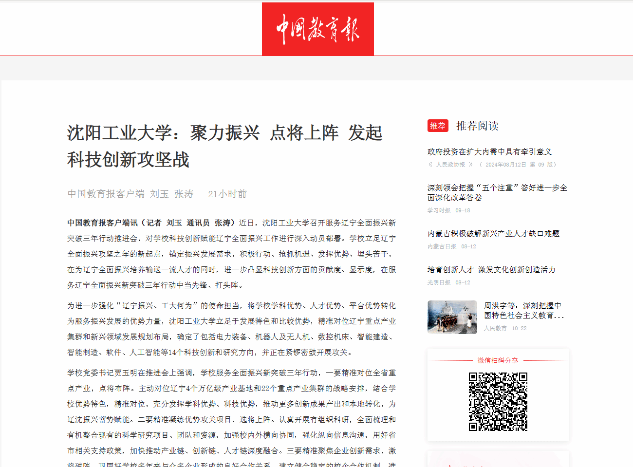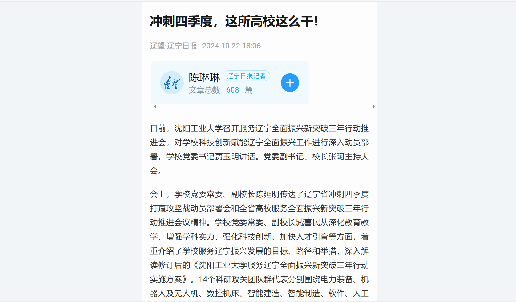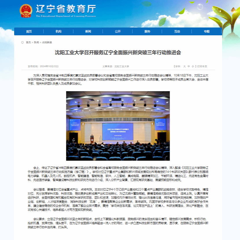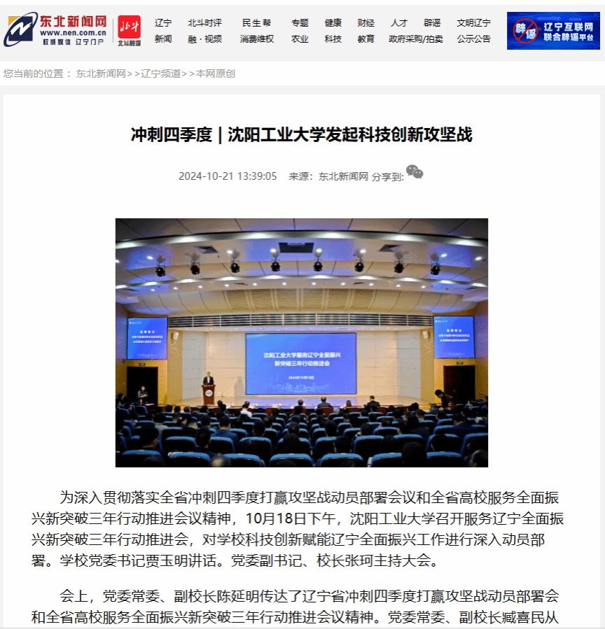 为深入贯彻落实辽宁省全省冲刺四季度打赢攻坚战动员部署会议和全省高校服务全面振兴新突破三年行动推进会议精神,10月18日下午,江南娱乐召开服务辽宁全面振兴新突破三年行动推进会。大会的举行引起了广泛的关注,产生了强烈反响,中国教育报、中国工业新闻网、东北新闻网、辽望、辽宁省教育厅等媒体平台相继报道。