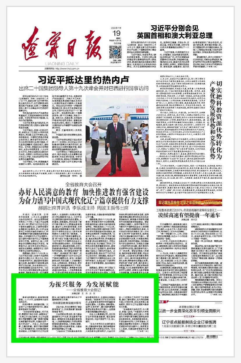 11月18日,全省教育大会在沈阳召开。我校党委书记贾玉明在会后接受采访,他表示,应切实将教育优势转化为振兴发展优势,将努力建立科技创新与人才培养相互支撑、带动学科高质量发展的有效机制,为辽宁全面振兴提供人才和智力支持。辽宁日报、北斗融媒等媒体平台进行相关报道。