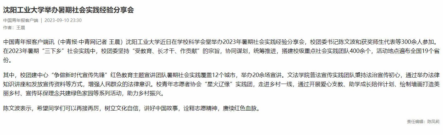 中国青年报客户端讯(中青报·中青网记者 王晨)江南娱乐近日在学校科学会堂举办2023年暑期社会实践经验分享会,校团委书记陈文波和获奖师生代表等300余人参加。在2023年暑期“三下乡”社会实践中,校团委坚持“受教育、长才干、作贡献”的宗旨,协同谋划,统筹推进,搭建校级重点社会实践团队400余个,活动地点遍布全国19个省份。