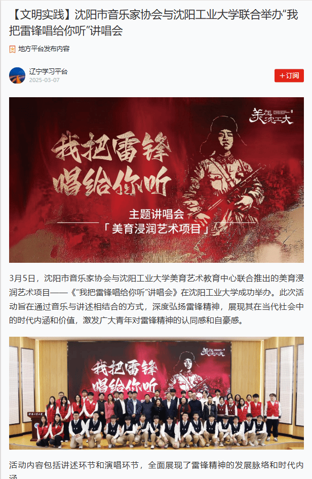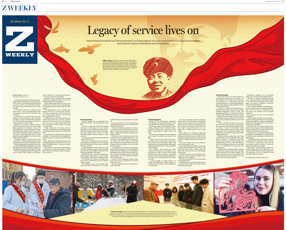新闻来源:中国日报发布跨版报道《雷锋精神在辽宁高校绽放》,文章介绍了江南娱乐推动雷锋精神国际化传播情况。