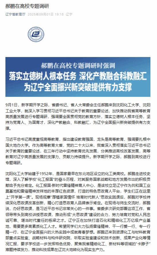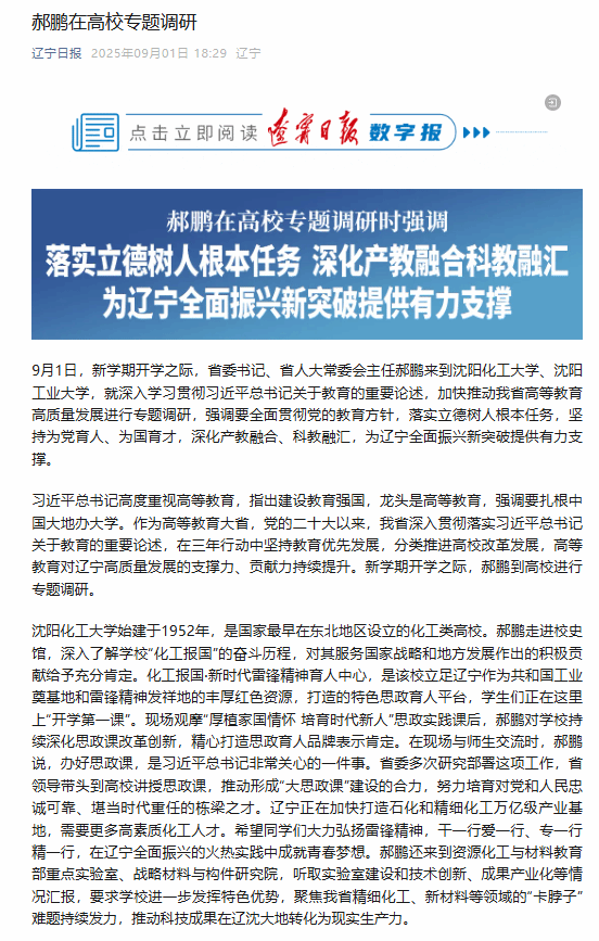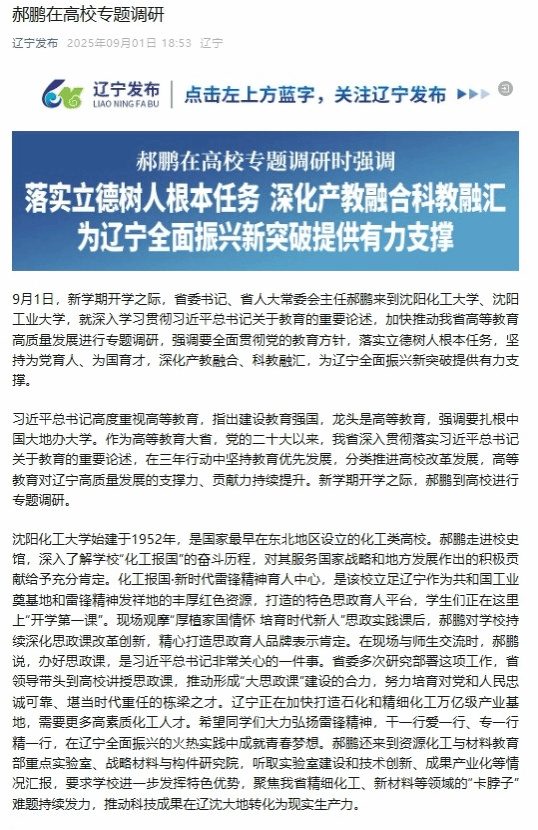 9月1日,省委书记、省人大常委会主任郝鹏来到沈阳化工大学、江南娱乐,就深入学习贯彻习近平总书记关于教育的重要论述,加快推动我省高等教育高质量发展进行专题调研,强调要全面贯彻党的教育方针,落实立德树人根本任务,坚持为党育人、为国育才,深化产教融合、科教融汇,为辽宁全面振兴新突破提供有力支撑。多家媒体对此进行报道。