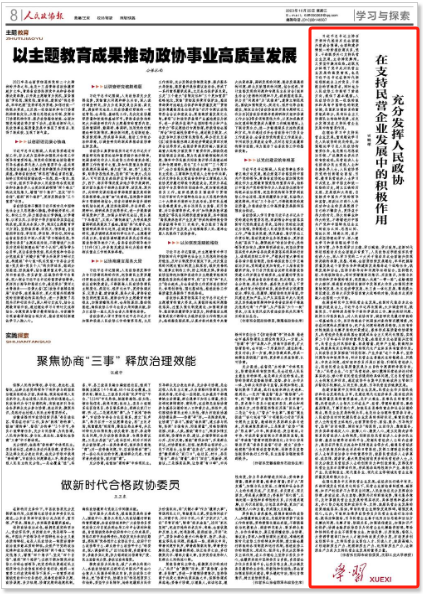 习近平总书记主持召开新时代推动东北全面振兴座谈会强调,全面构建亲清统一的新型政商关系,党员、干部既要关心支持民营企业发展,主动排忧解难,又要坚守廉洁底线。这既充分体现了党中央对民营企业发展的高度重视,也是习近平总书记在新时代新征程新起点上对党员、干部提出的明确要求,同时也为人民政协工作指明了前进方向,提供了基本遵循。人民政协作为统一战线的组织和具有中国特色的制度安排,是国家治理体系的重要组成部分,具有社会主义协商民主的独特优势,应充分发挥其在支持民营企业发展中的重要作用。