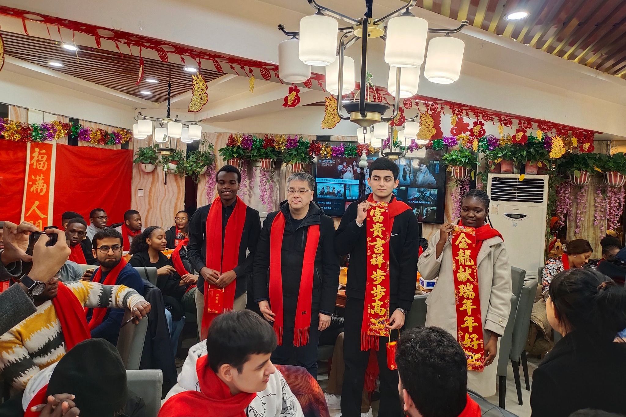 国际教育学院领导班子和教师代表组织52名在沈留学生包饺子、话年俗、表演节目,宣传中国文化,欢度农历新年。贾玉明为留学生送去学校关爱和新春祝福,为他们佩戴红色围巾。张珂为留学生送上对联。校领导详细了解留学生学习、生活情况,叮嘱大家要常与家人、老师联系,希望他们能在中国新年的欢快氛围下,感受中华优秀传统文化,能够在学校度过一个幸福、平安的龙年春节。留学生们表示一定不辜负学校期望,好好利用假期,努力学习,不断充实自我,立志成长成才。