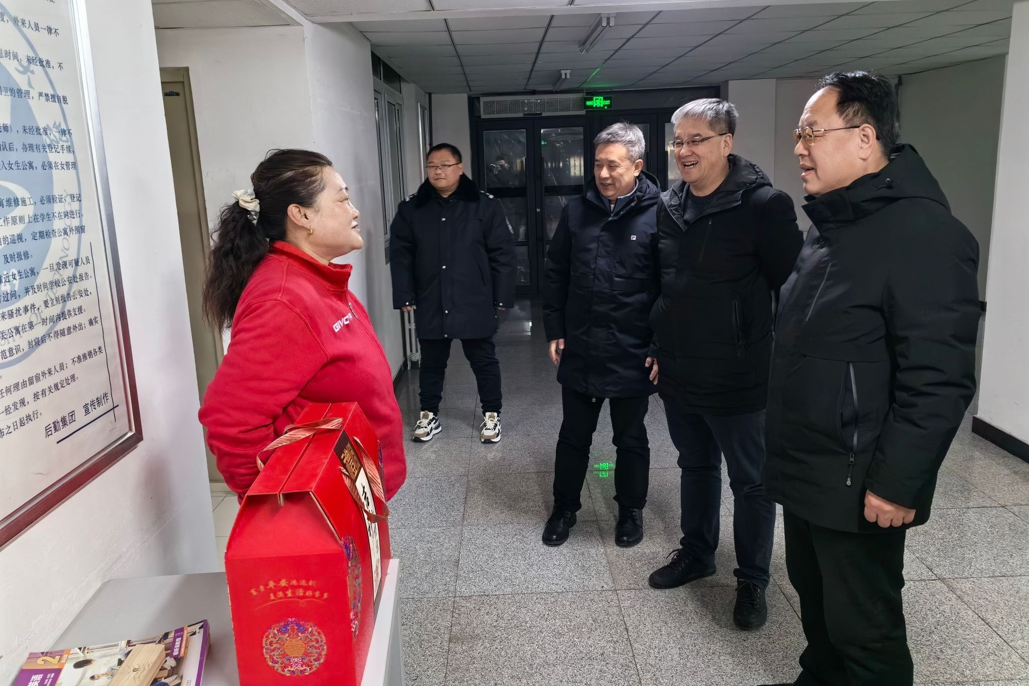 在教师公寓,校领导一行看望慰问值班工作人员,并把慰问品送到他们手中。贾玉明、张珂询问了解安全保卫、服务保障情况,指出教师公寓事关广大教师的生活和幸福,要不断完善综合管理和强化服务标准,为教师创造良好的生活环境。同时,嘱咐大家在做好各项工作的同时,关注天气变化、注意抗寒保暖,确保公寓安全的同时也要确保自身安全。