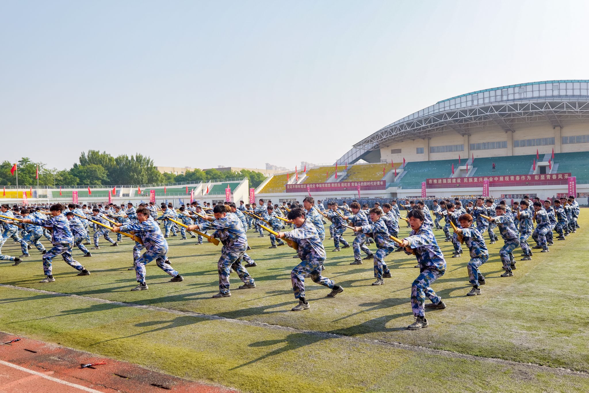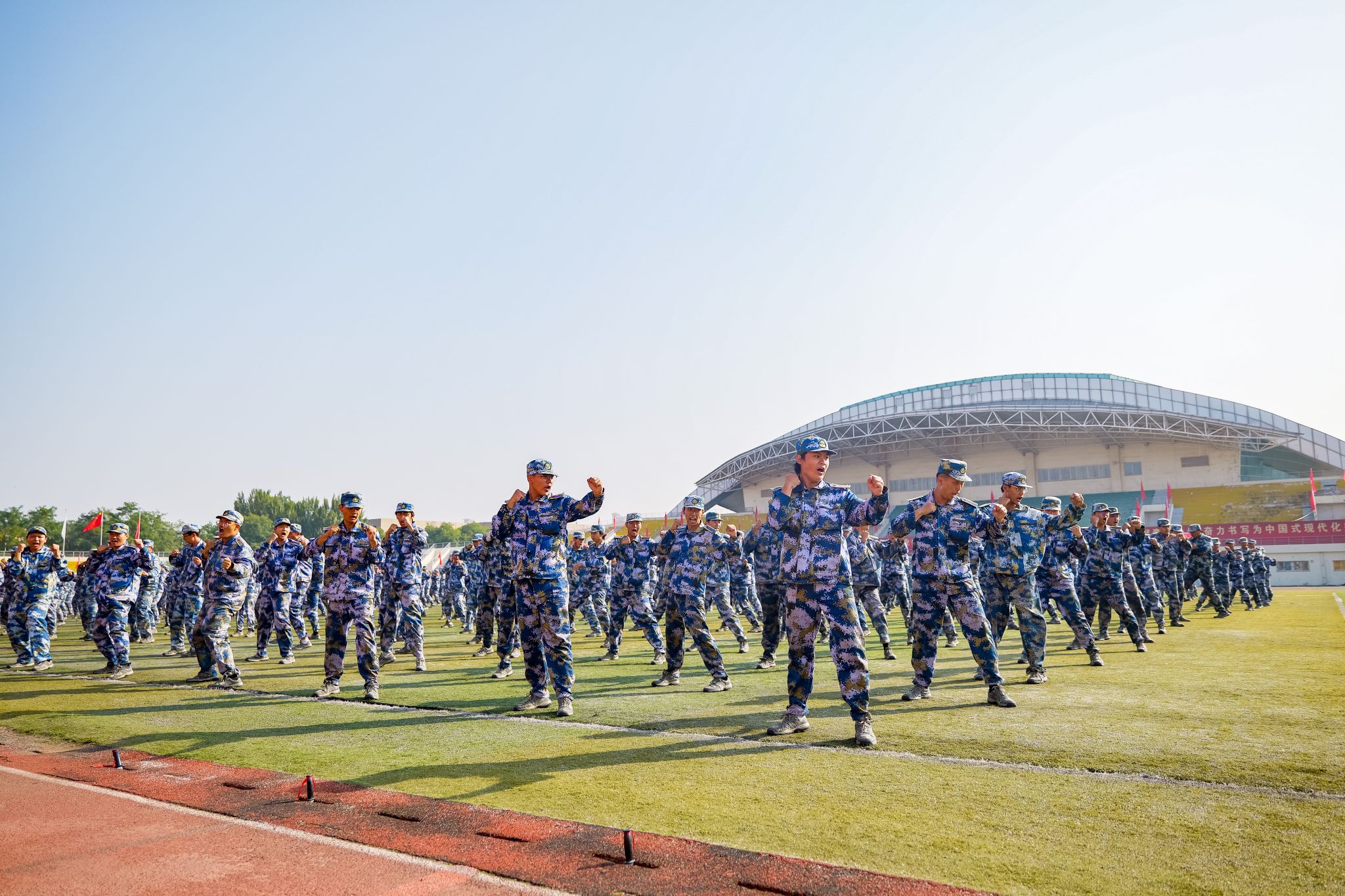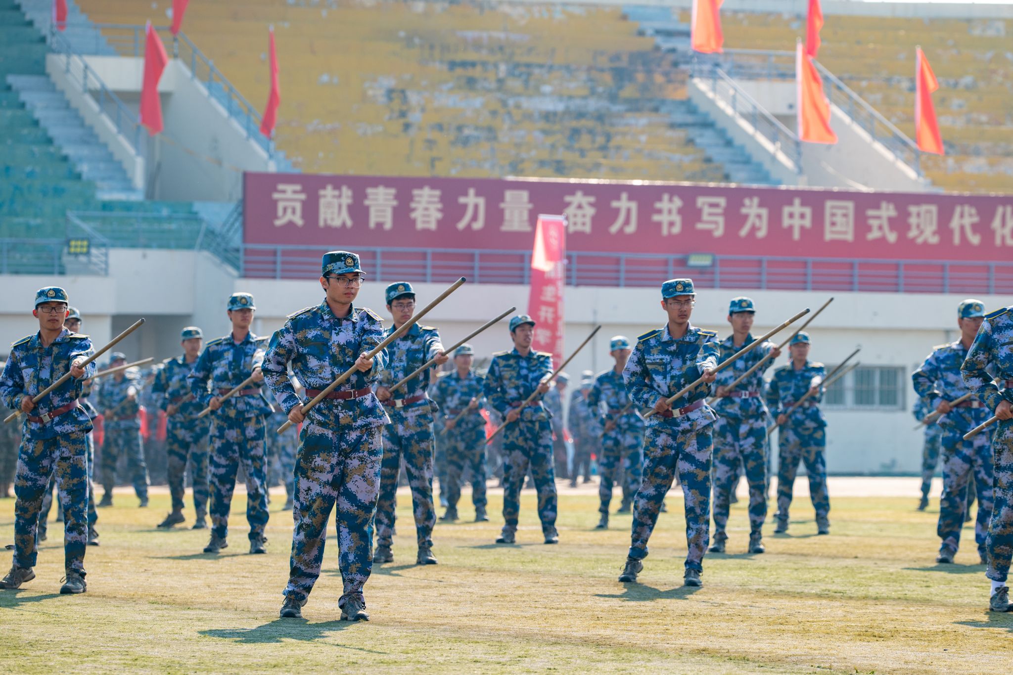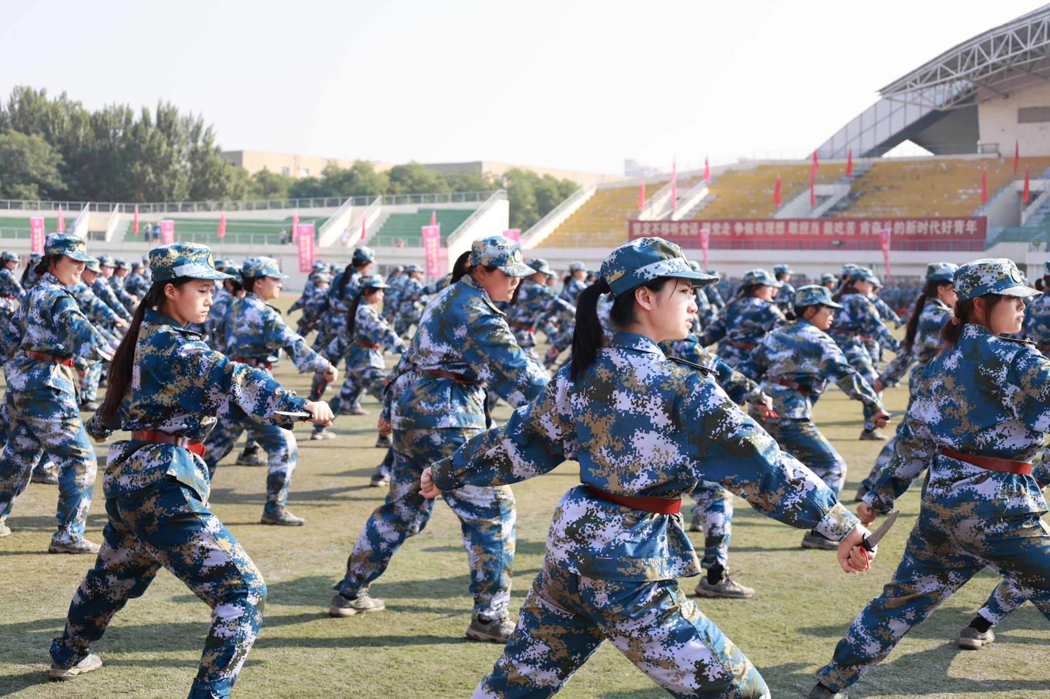 训练有素、果敢勇毅。新生们先后表演了擒敌拳、刺杀操、应急棍、匕首操、健康操等训练科目,气势如虹、动作利落的表演赢得了现场阵阵掌声与喝彩。