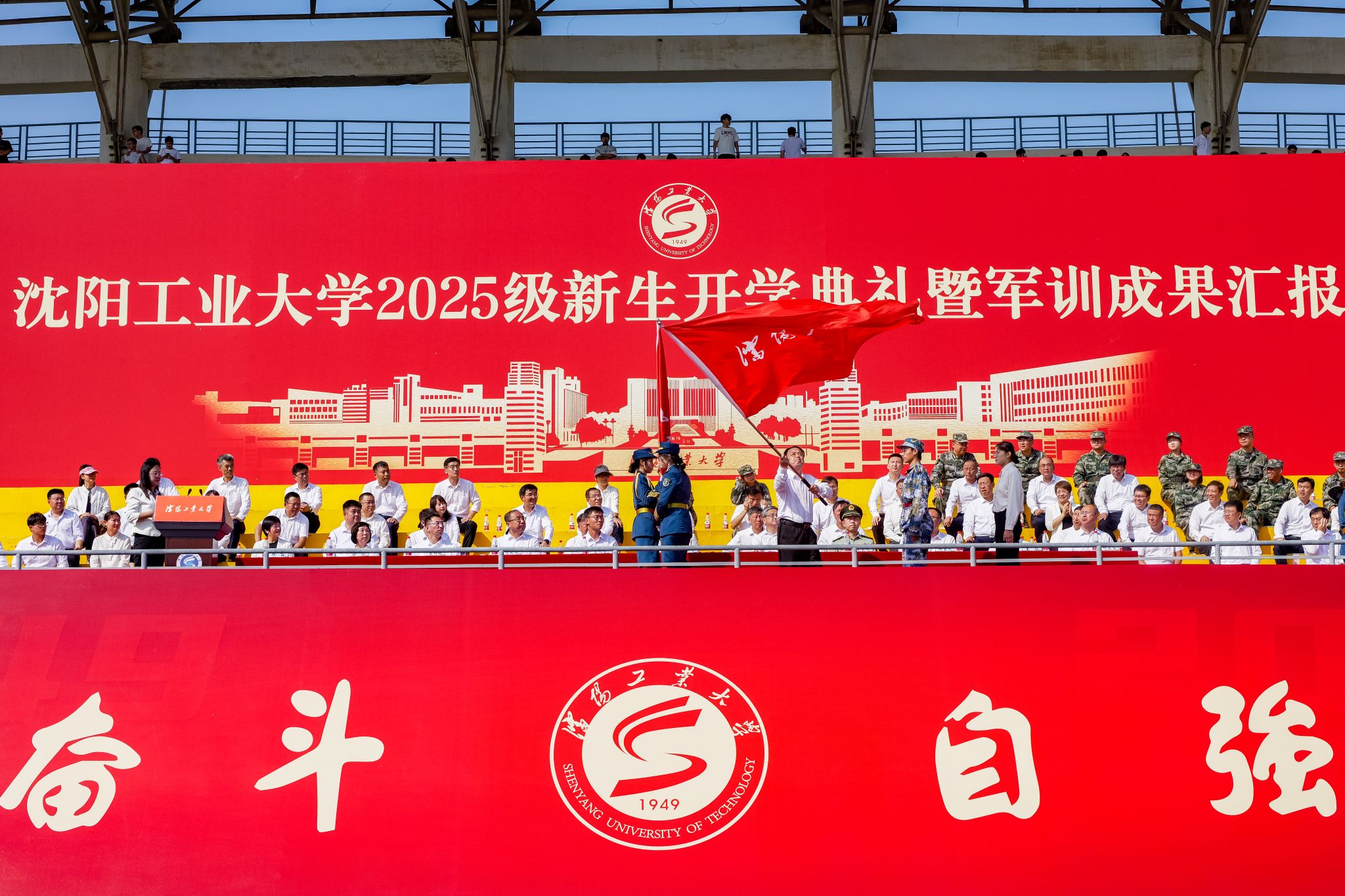 典礼现场,贾玉明为2025级新生代表授旗。这面承载着学校历史与荣耀的旗帜,在新一代“工大人”手中完成了庄严的传递,也象征着学校精神血脉的延续与传承。