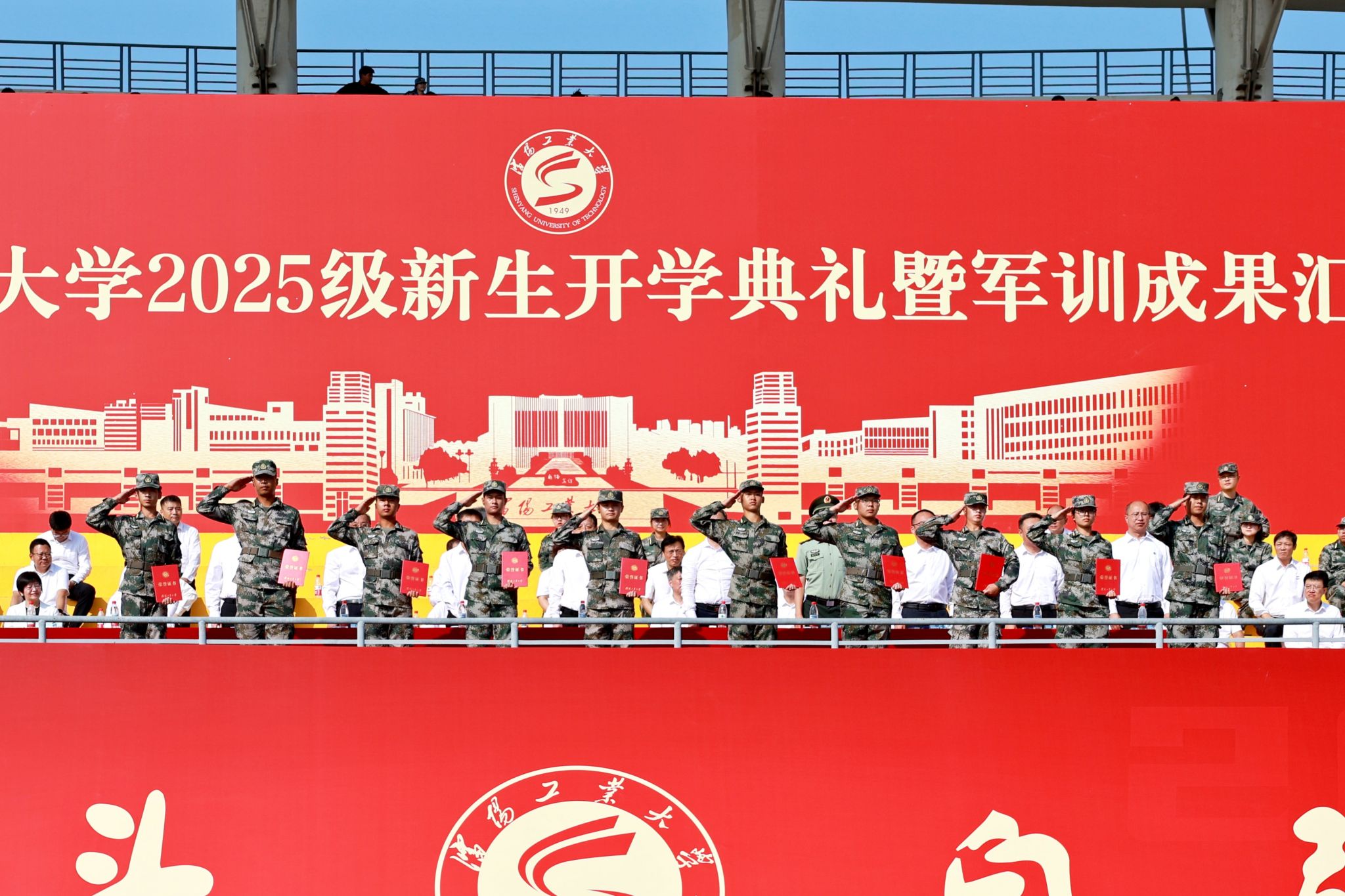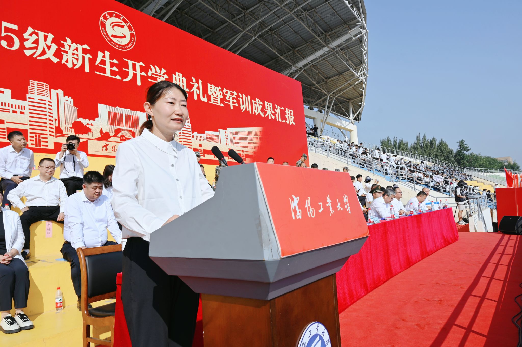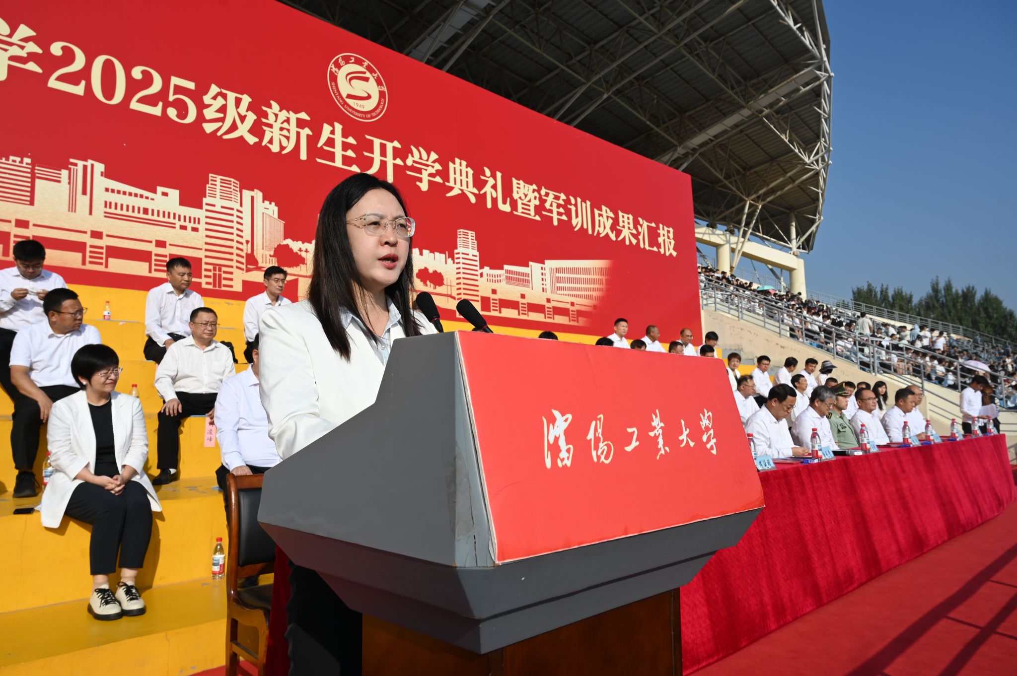 风鹏正举,逐梦启航。9月13日,江南娱乐2025级新生开学典礼暨军训成果汇报会在中央校区南区体育场、辽阳分校体育场举行。校领导贾玉明、张珂、柯丽、陈延明、臧喜民、夏明超、王彪、孙杨、鄂立飞,相关职能部门负责人、各二级学院党政负责人、学生工作干部、军训教官、2025级全体学生参加大会。学校特别邀请2003届机械设计制造及其自动化专业毕业生、中国科学院核心岗位特聘研究员、博士生导师唐元贵校友及承训部队代表辽宁省军区警备纠察队队长王竞择出席大会。学校党委副书记柯丽主持活动。