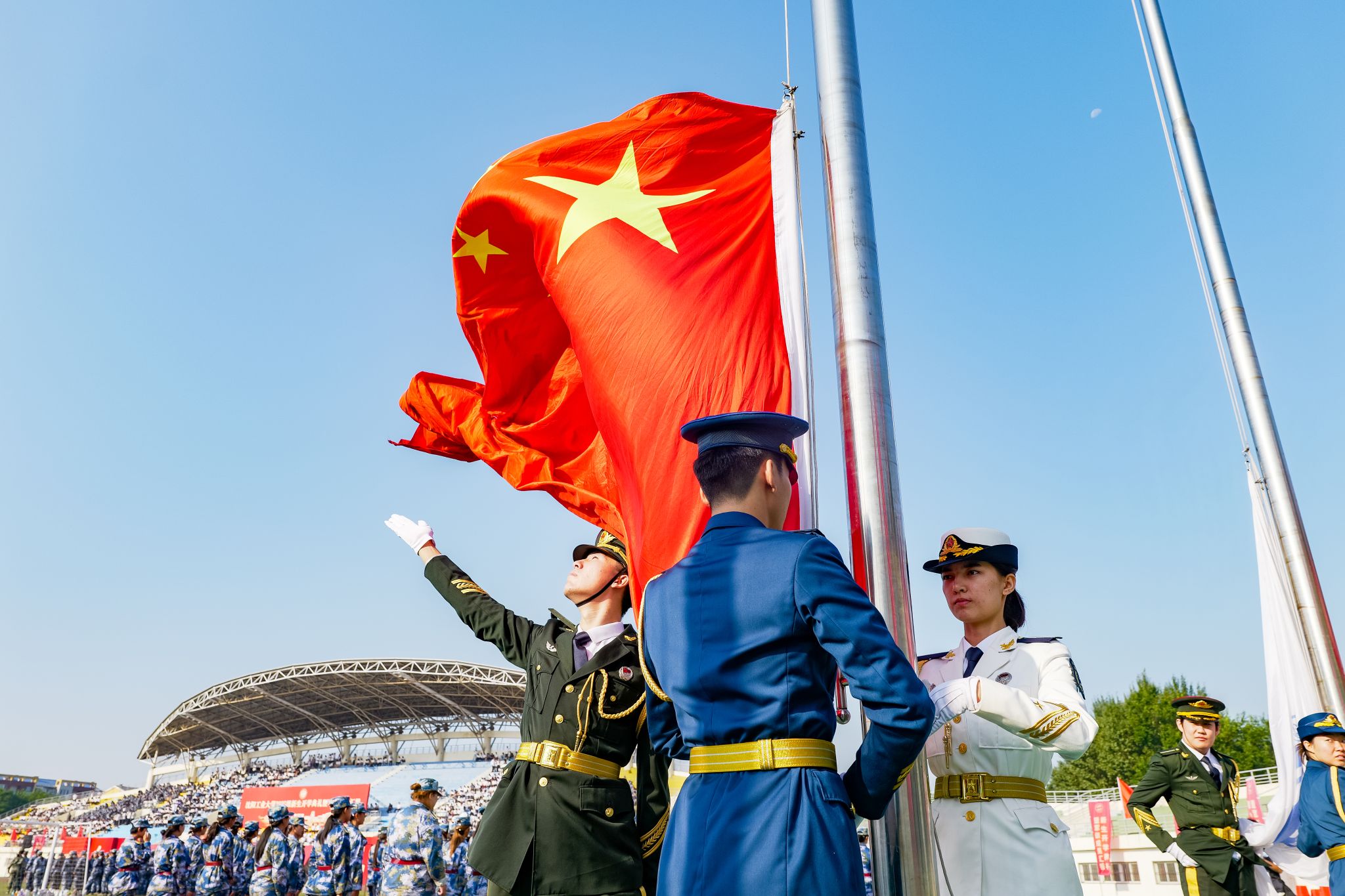 在雄壮的国歌声中,鲜艳的五星红旗冉冉升起,全场师生齐唱国歌,行注目礼。