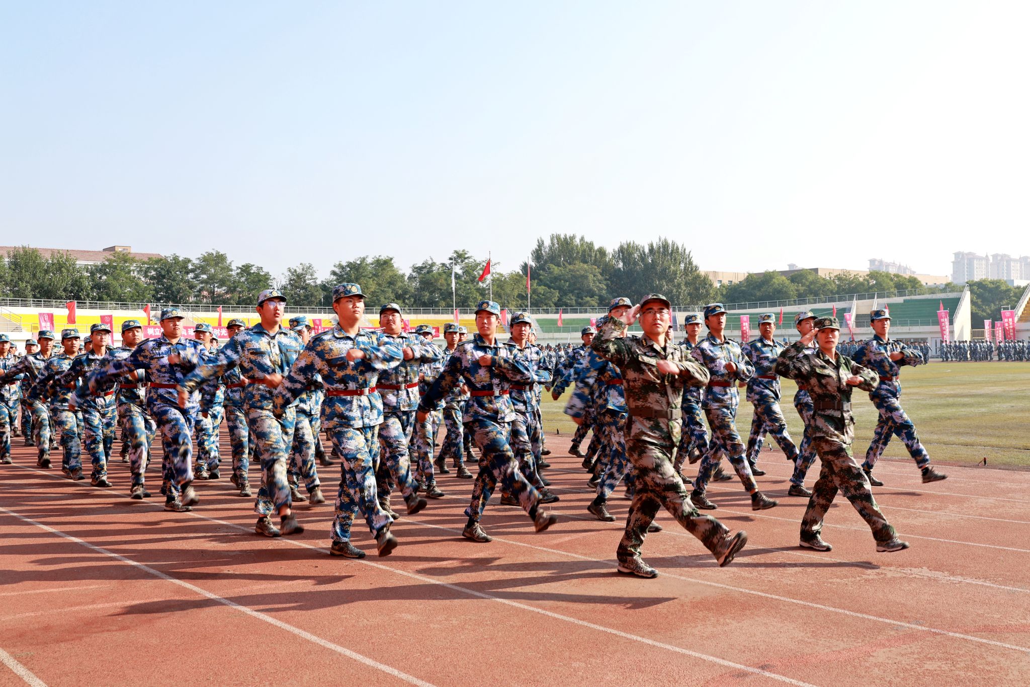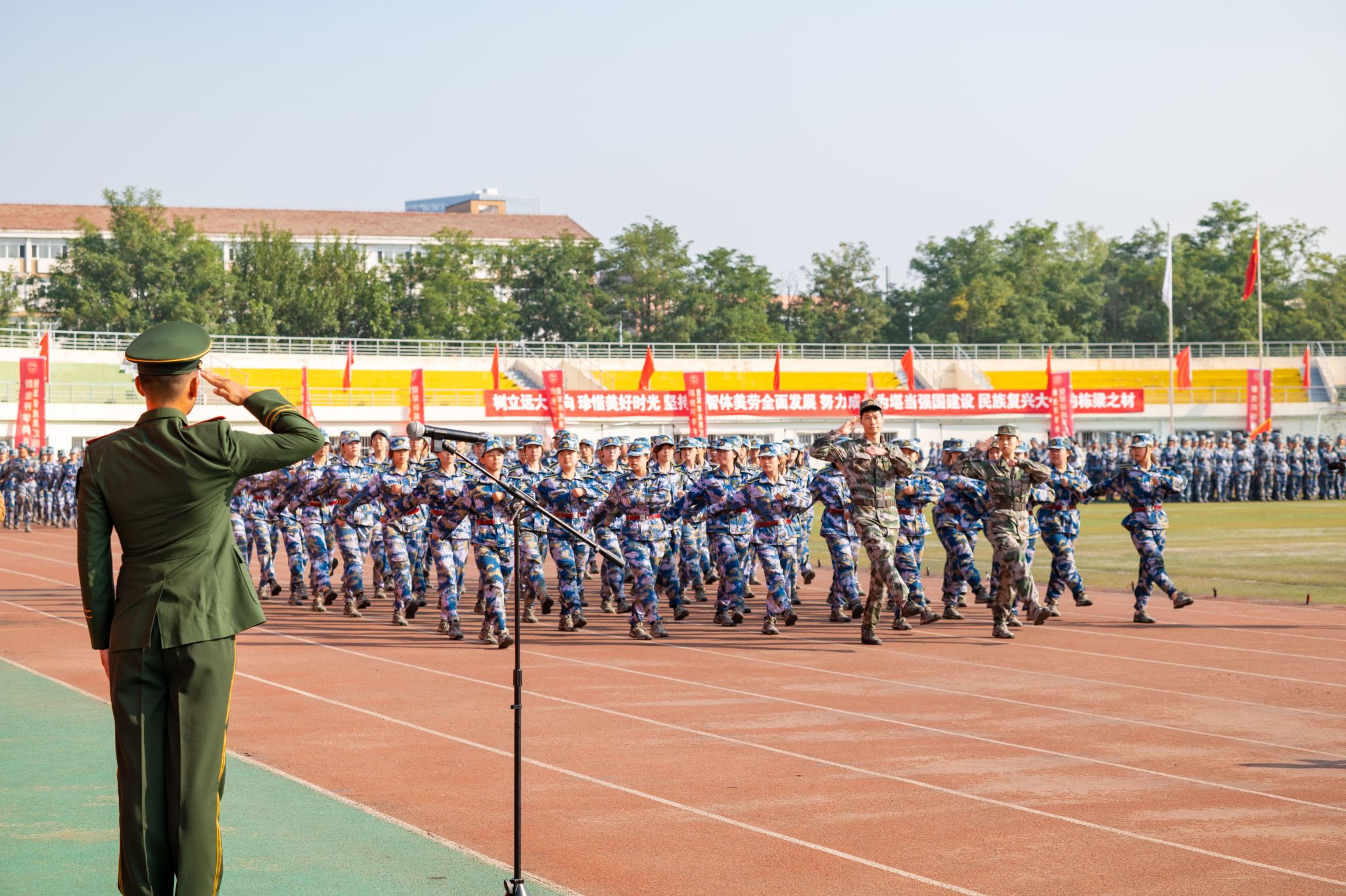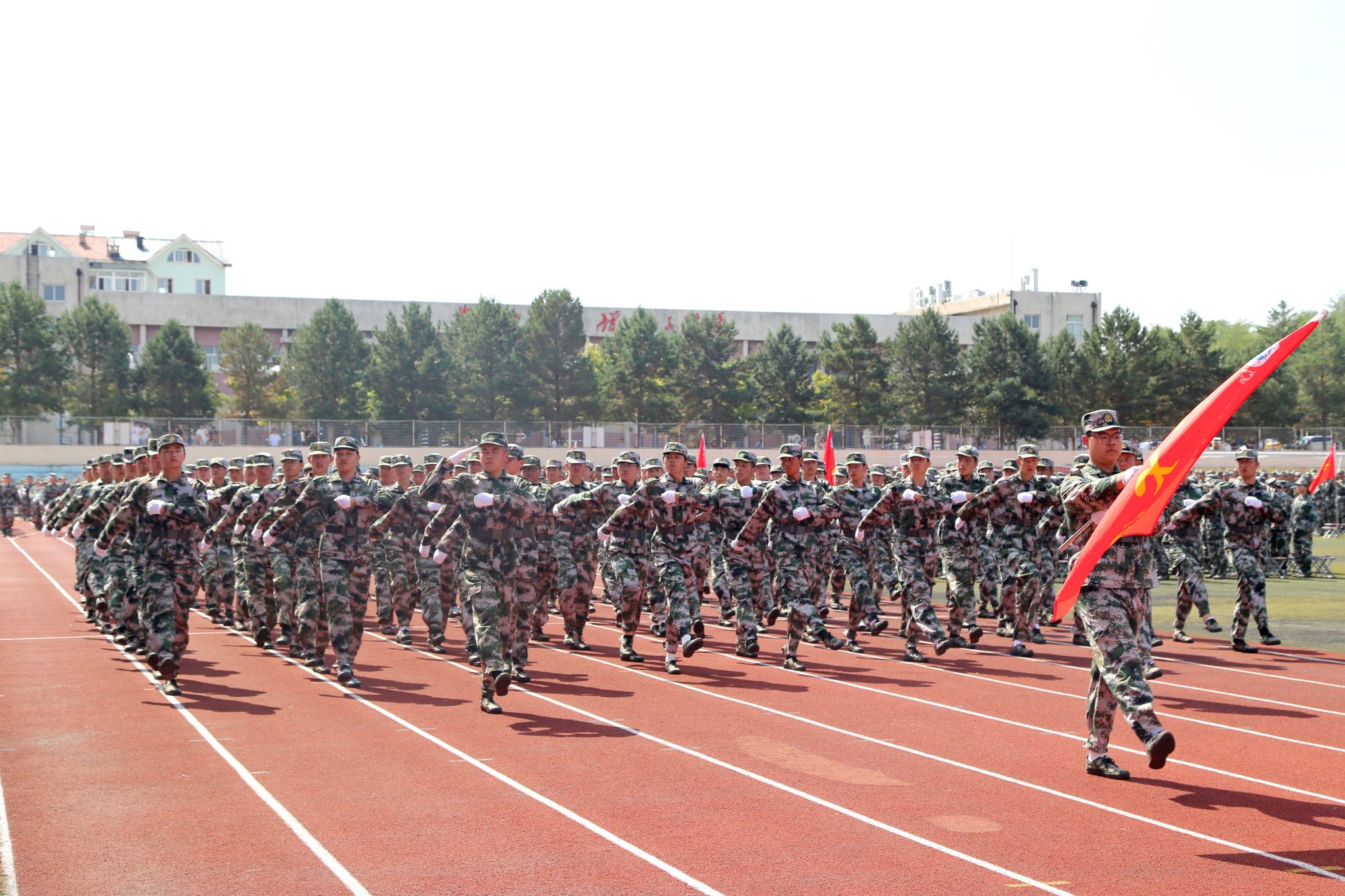 伴随着激昂的分列式进行曲,2025级新生们以整齐划一的队列依次通过主席台。本次军训共53个训练方队,在各学院学生工作负责人与新生辅导员的带领下,各方队步伐坚定有力、口号铿锵嘹亮,接受主席台上领导和老师们的检阅。