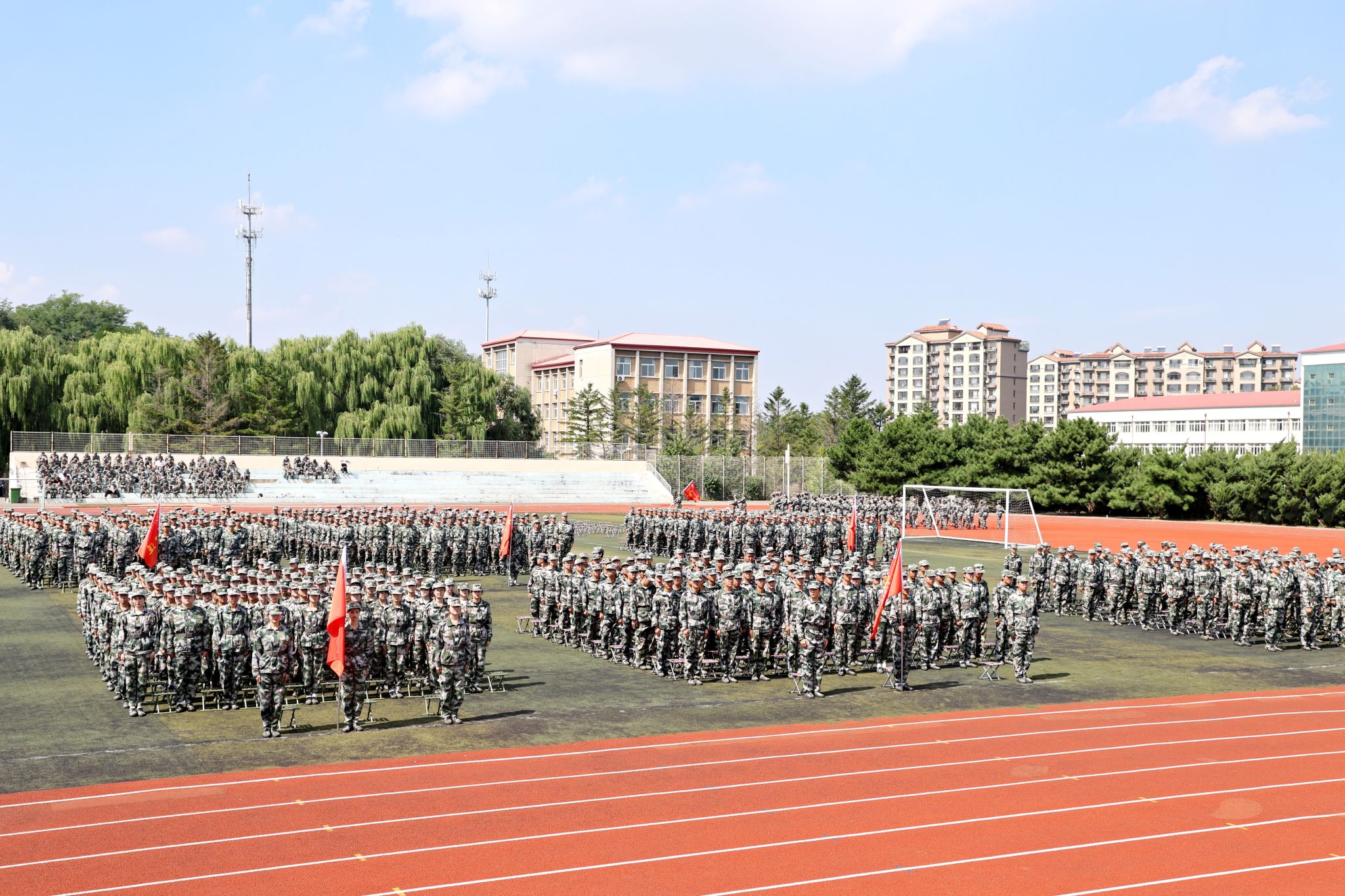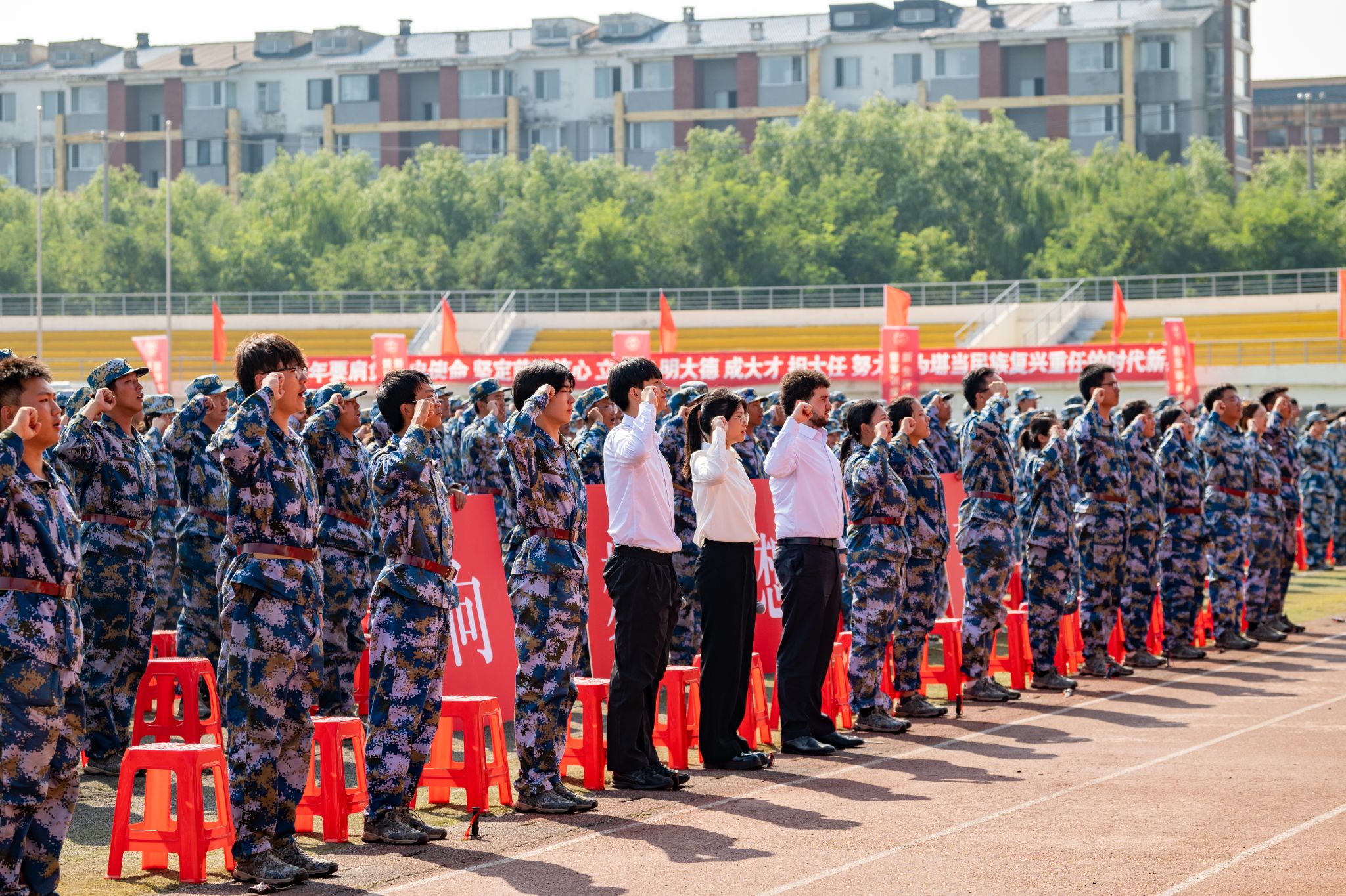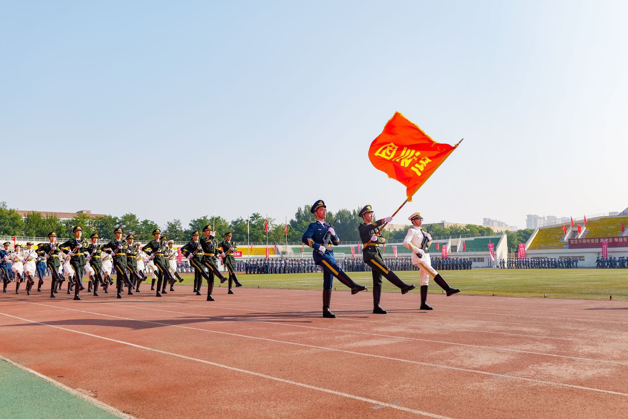 伴随着激昂的分列式进行曲,2025级新生们以整齐划一的队列依次通过主席台。本次军训共53个训练方队,在各学院学生工作负责人与新生辅导员的带领下,各方队步伐坚定有力、口号铿锵嘹亮,接受主席台上领导和老师们的检阅。