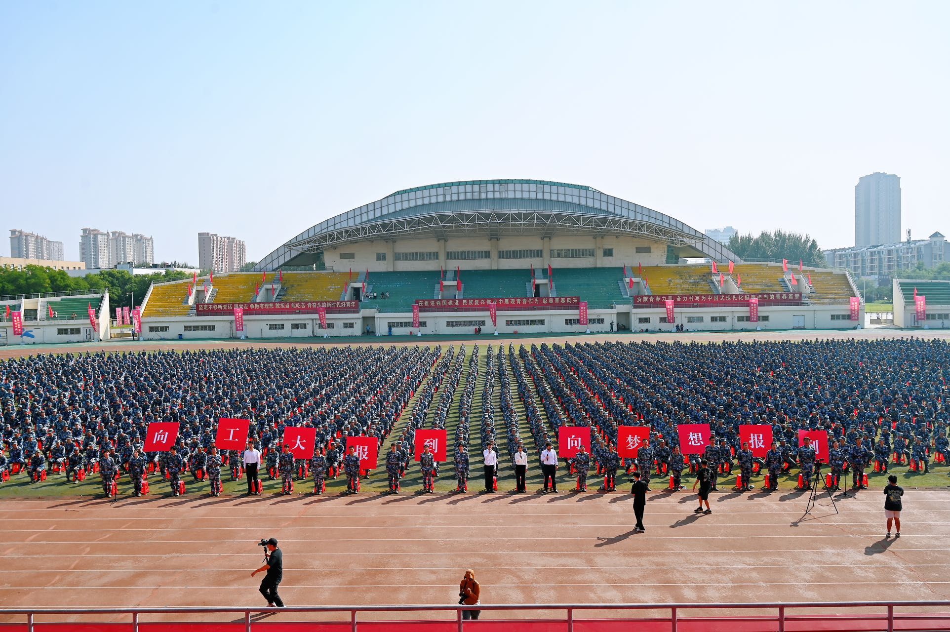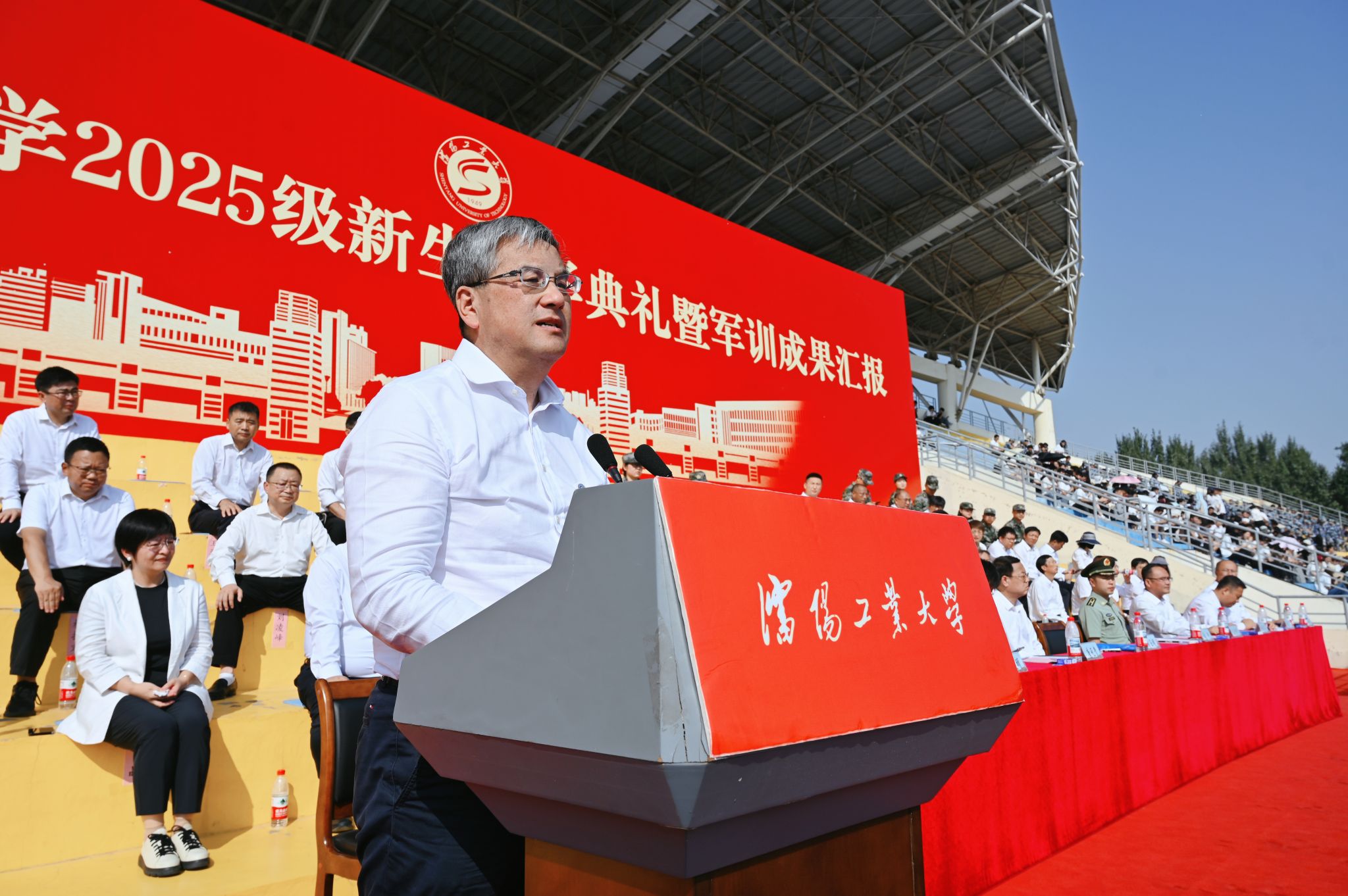 张珂代表学校向新同学表示热烈欢迎和诚挚祝贺。他充分肯定了同学们在军训中展现出的昂扬斗志和坚韧意志,勉励大家要继续保持这种顽强拼搏的精神风貌,在今后的学习生活中勇往直前、不断超越自我。他强调,新时代的青年学子肩负着实现中华民族伟大复兴的历史使命,希望大家能够珍惜宝贵的大学时光,立报国之志、修立身之德、求学问之真、创未来之新,在工大沃土上收获成长。张珂向2025级同学们提出四点期望,一是要立报国之志,做心怀家国的追梦人。要厚植家国情怀,砥砺强国之志,将个人理想融入国家发展伟业,在实现中华民族伟大复兴的征程中找准人生坐标。二是要修立身之德,做全面发展的践行者。要把“立德修身”放在首位,恪守学术诚信、培养团队精神、常怀感恩之心,做“有本事、更有良心”的工大人。三是要求学问之真,做知行合一的实干者。要勤于思考、勇于创新,善于在实践中检验真理,成长为“善于解决复杂工程问题”的工程师和具有“突出技术创新能力”的实干家。四是要创未来之新,做勇于探索的开拓者。要主动拥抱时代变化,敢于突破传统思维的边界,在科技创新的浪潮中开拓进取,以敢为人先的精神探索未知领域,争做引领时代的先锋。