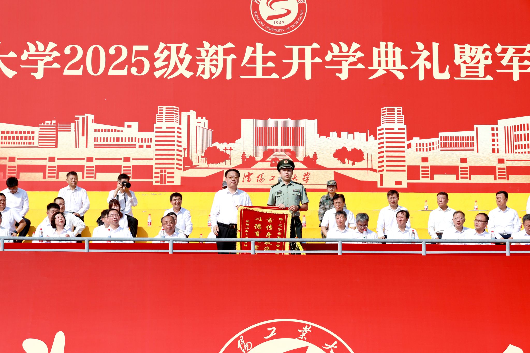 党委书记贾玉明向辽宁省军区警卫勤务队赠送锦旗,感谢辽宁省军区教官对学生军训工作的辛勤付出和悉心指导。